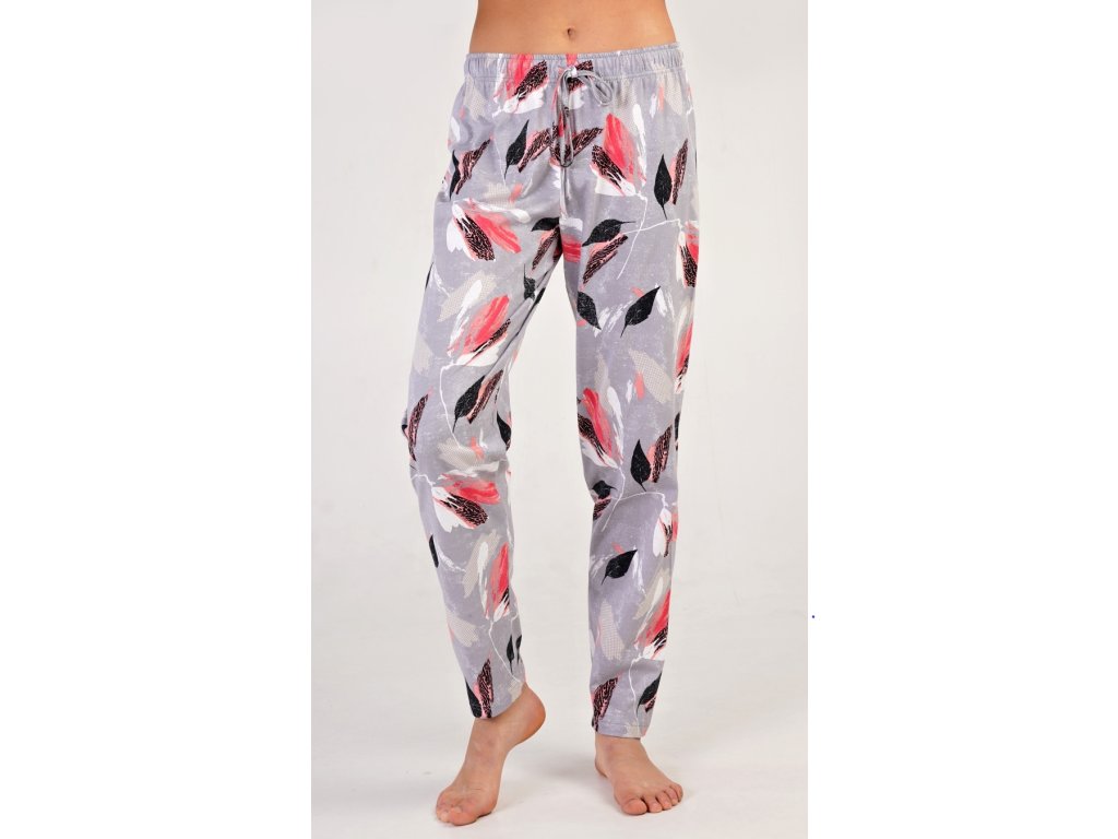 Dámske bavlnené pyžamové nohavice Lucie. Dlhé nohavice Lucie sú zdobené farebnými listami na šedom podklade. Nohavice sú v páse do gumy a majú praktickú šnúrku na stiahnutie, nemajú vrecká. Použitý bavlnený materiál je príjemný a poddajný na dotyk. Nohavice sú vhodné aj na denné nosenie.