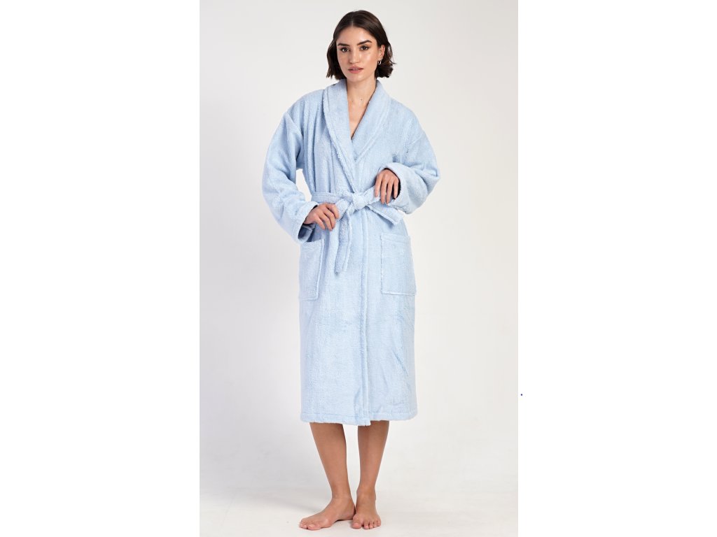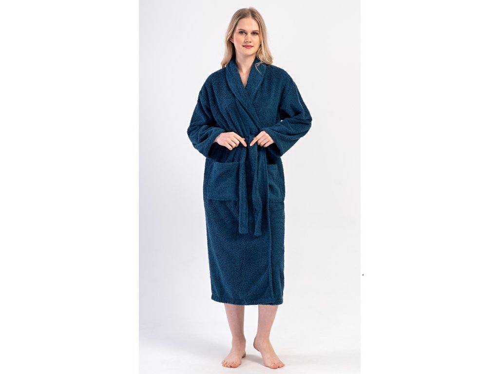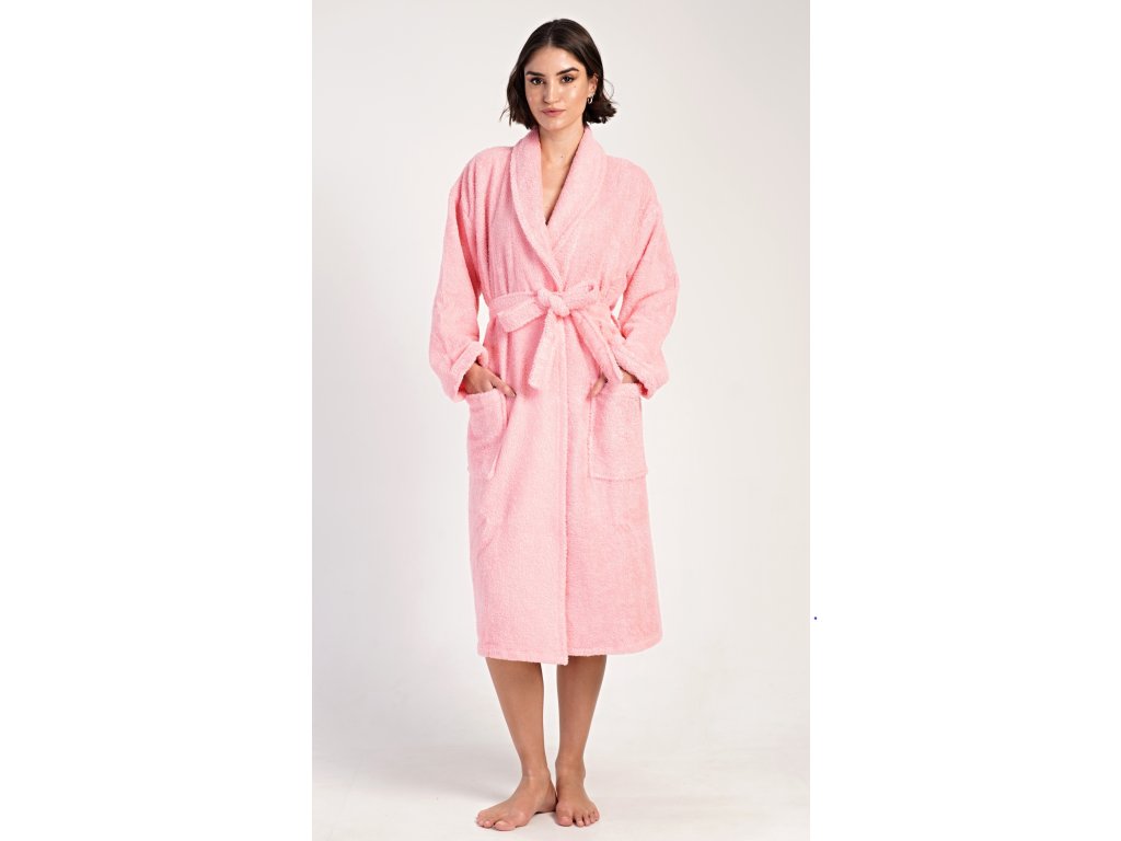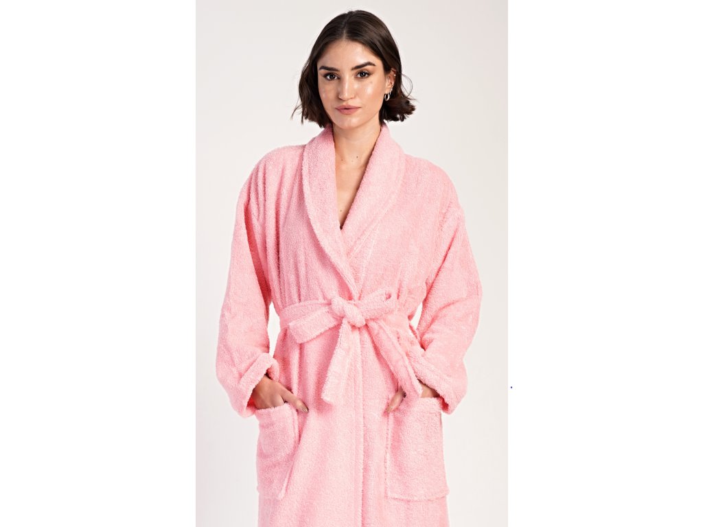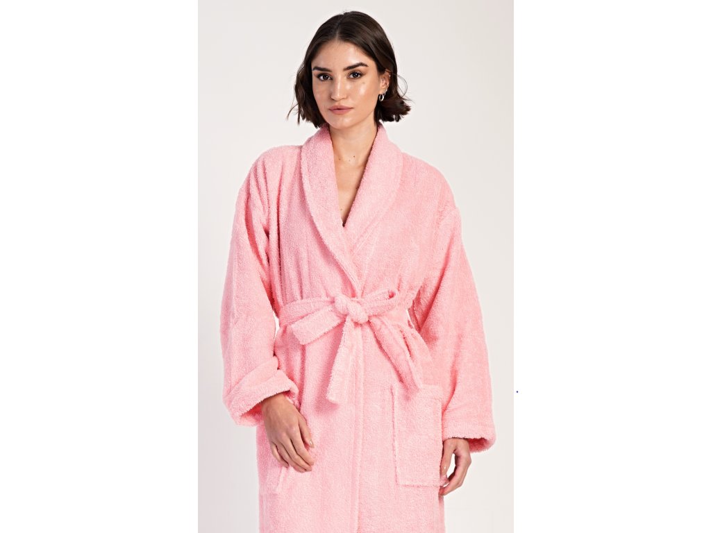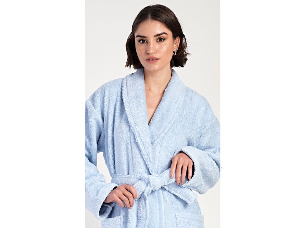 Dámsky dlhý froté župan so šálovým golierom Karolína. Dámsky dlhý župan so šálovým golierom, opaskom na stiahnutie a vreckami je vhodný po kúpeli aj na povaľovanie sa doma na gauči. Použitý bavlnený materiál je príjemný a poddajný na dotyk.
