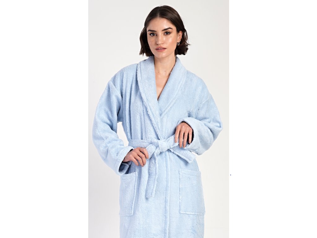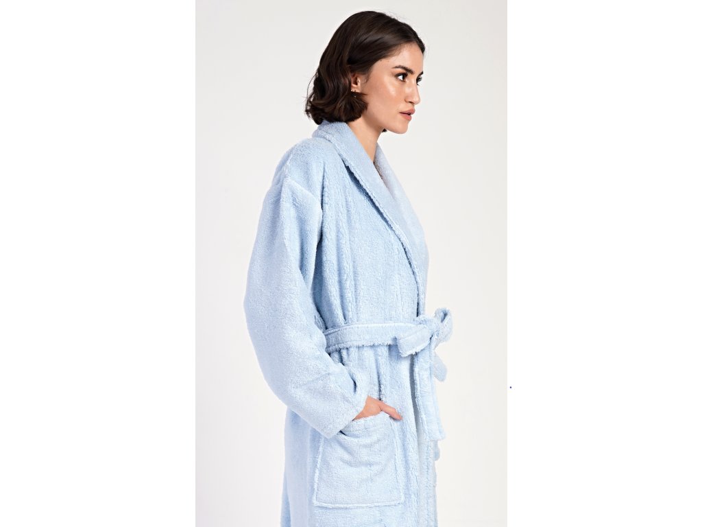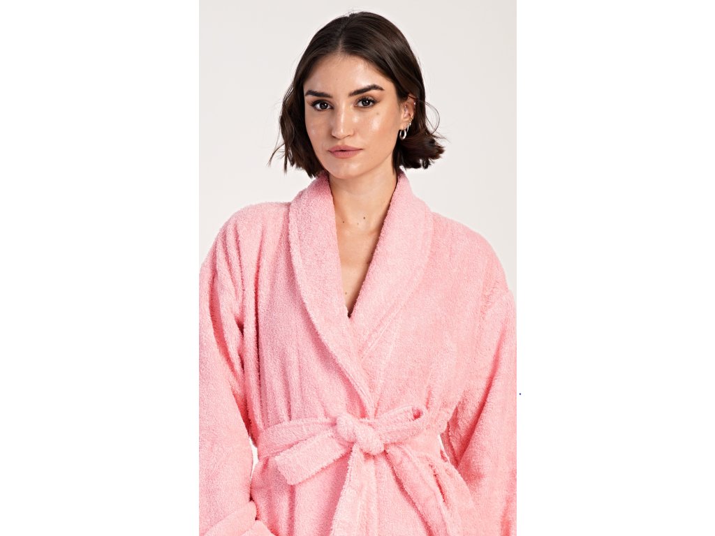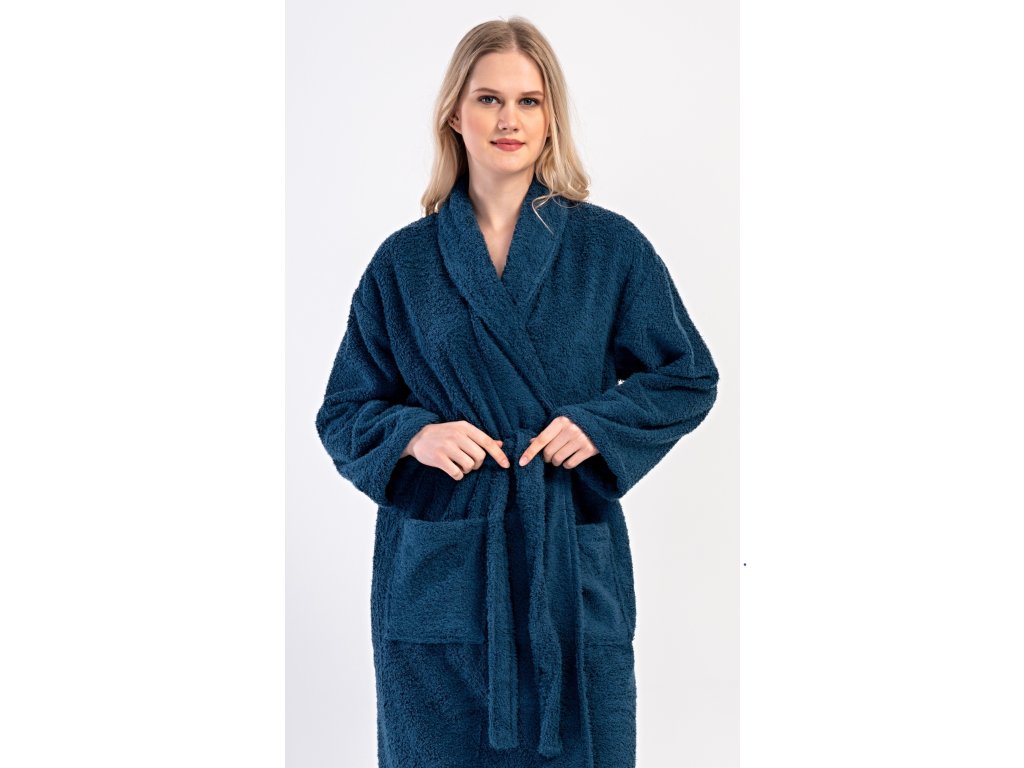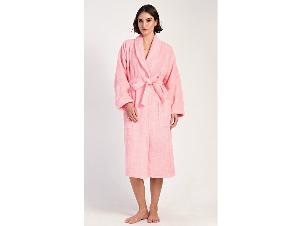 Dámsky dlhý froté župan so šálovým golierom Karolína. Dámsky dlhý župan so šálovým golierom, opaskom na stiahnutie a vreckami je vhodný po kúpeli aj na povaľovanie sa doma na gauči. Použitý bavlnený materiál je príjemný a poddajný na dotyk.
