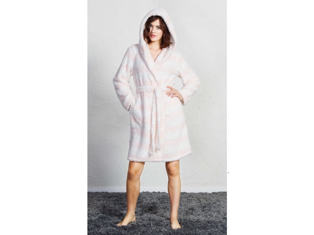 Dámsky krátky župan Leona s kapucňou. Pruhovaný jemný župan má kapucňu a opasok na zaväzovanie. Na prednom diele sú všité dve vrecká. Župan je vyrobený z poddajného materiálu príjemného na dotyk.
