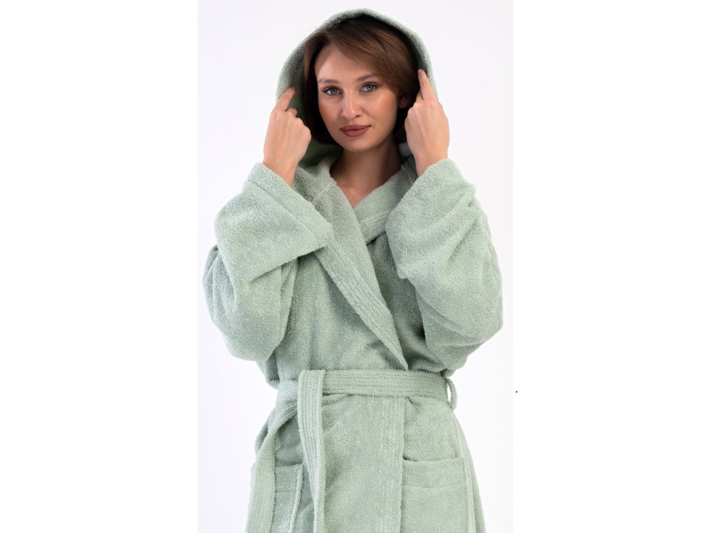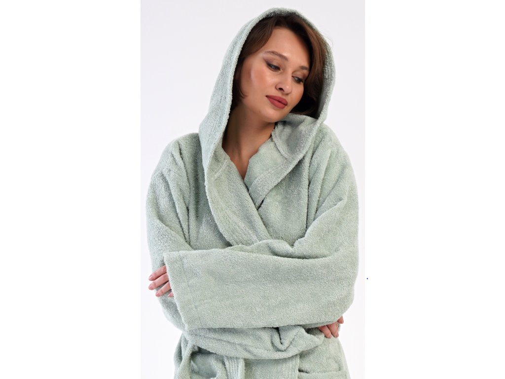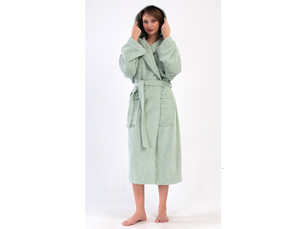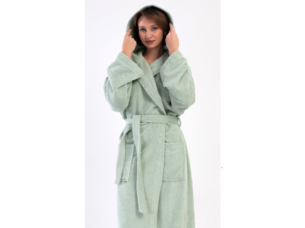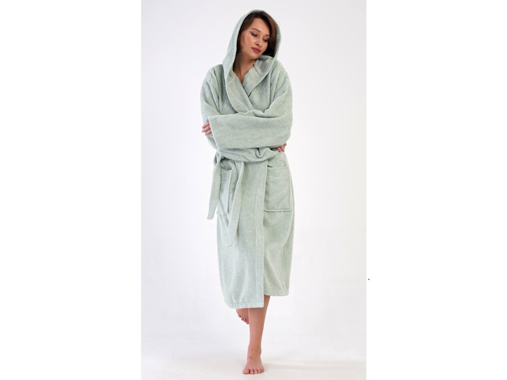 Dámsky bavlnený froté župan s kapucňou Mäta. Dámsky dlhý župan s kapucňou a opaskom na stiahnutie je vhodný po kúpeli aj na povaľovanie sa doma na gauči. Froté župan má praktické vrecká, ktoré oceníte pri návšteve wellness. Použitý bavlnený materiál je príjemný a poddajný na dotyk.