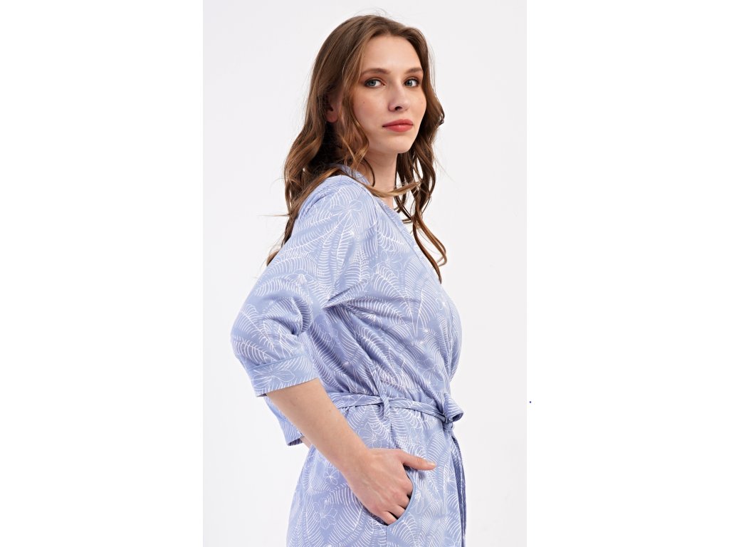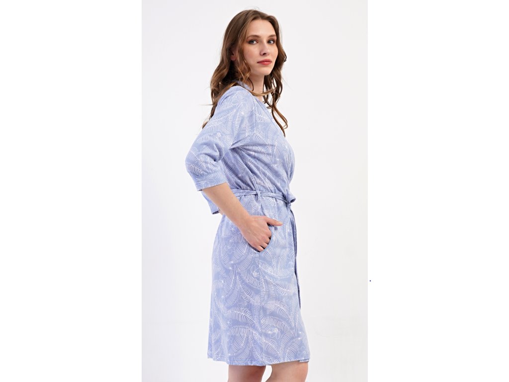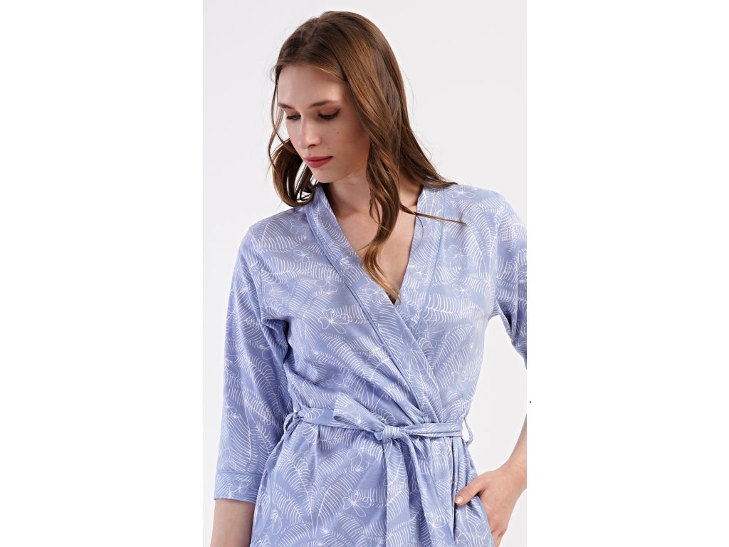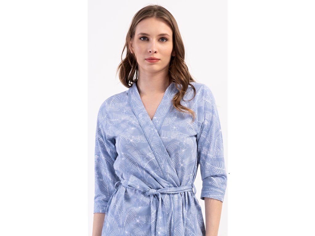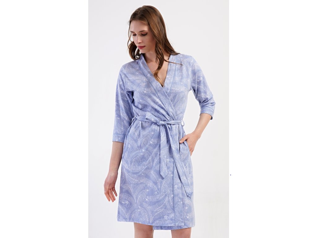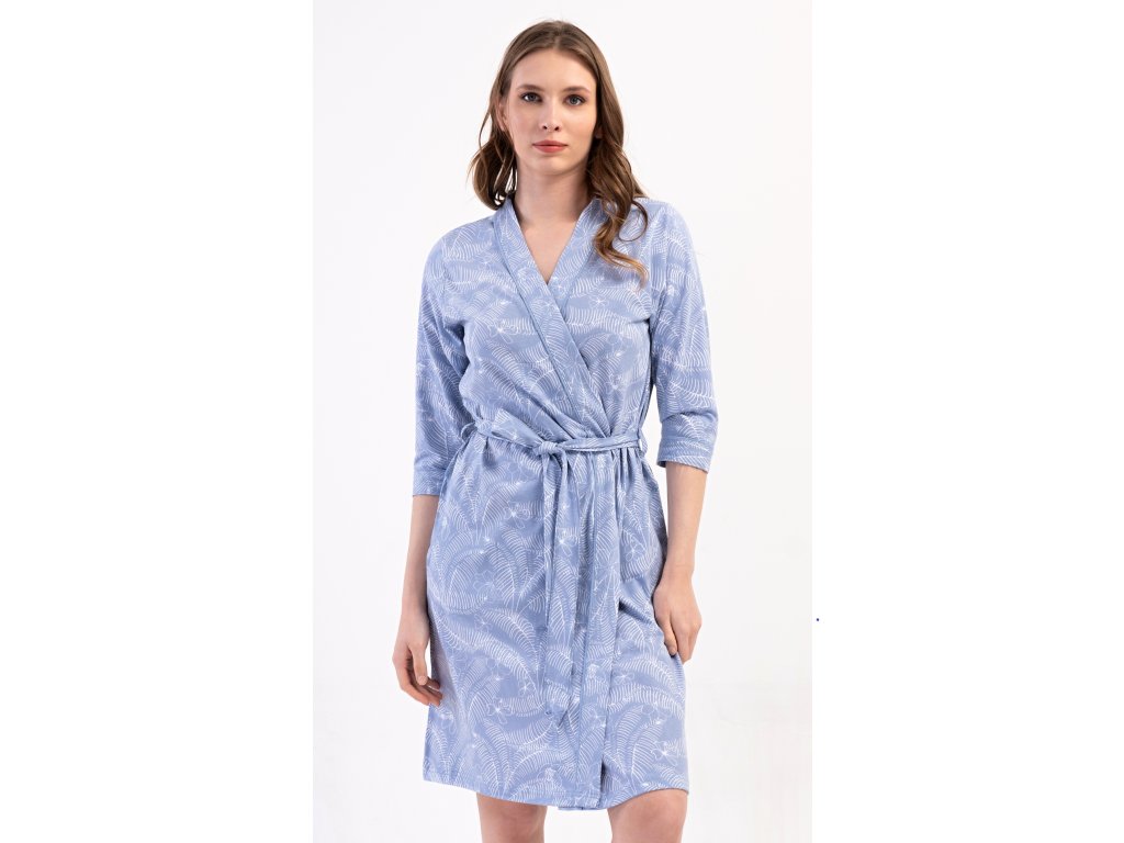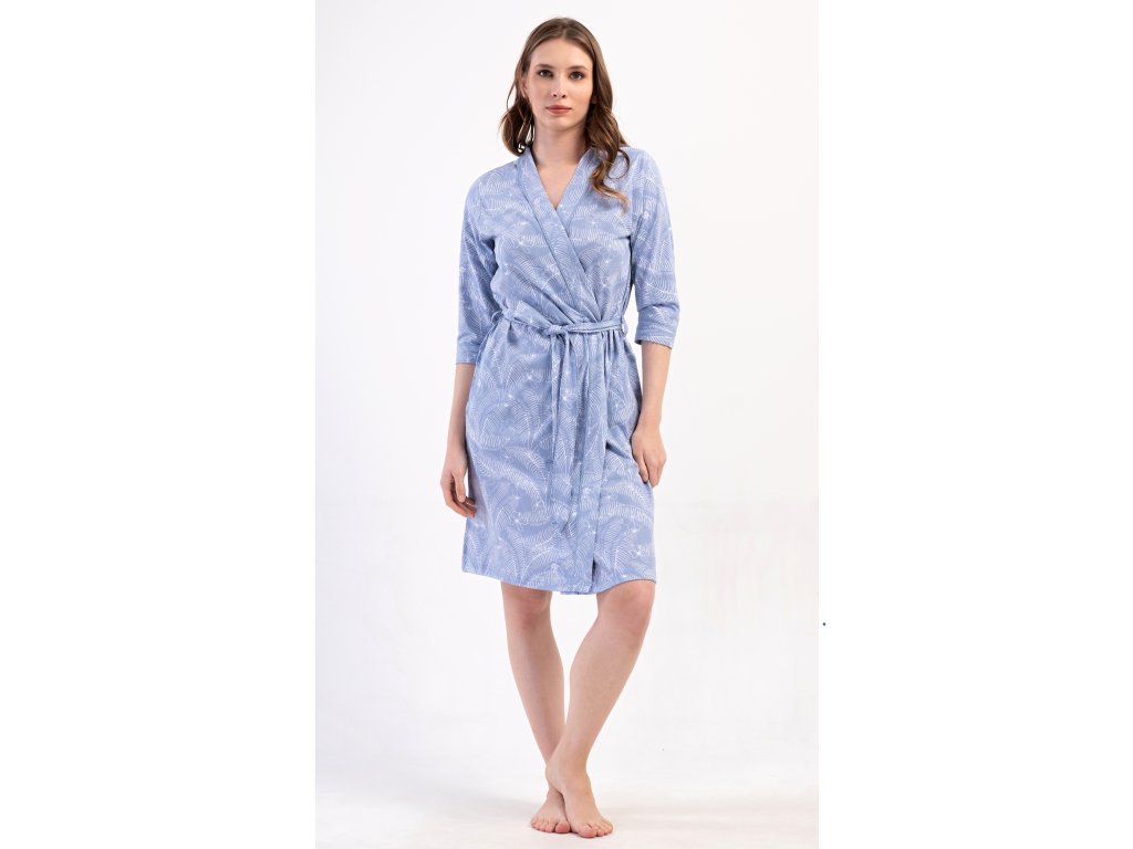 Dámsky krátky bavlnený župan Lenka. Dámsky župan v dĺžke pod kolená je potlačený kvetmi a listami. Župan má opasok na stiahnutie a praktické vrecká. Použitý bavlnený materiál je príjemný a poddajný na dotyk, saje a oceníte ho aj po kúpeli.