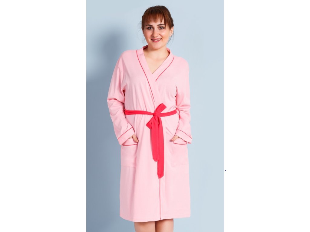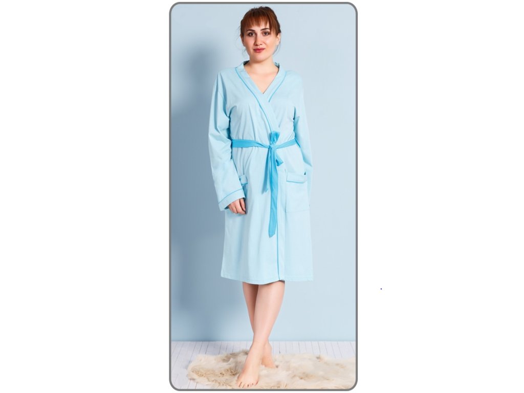 Dámsky bavlnený župan krátky Mariana. Župan s dĺžkou pod kolená má dlhý rukáv, výstrih je olemovaný farebnou stužkou a zaväzuje sa na farebný opasok. Na prednom diele sú našité dve vrecká. Bavlnený materiál je poddajný a príjemný na dotyk.