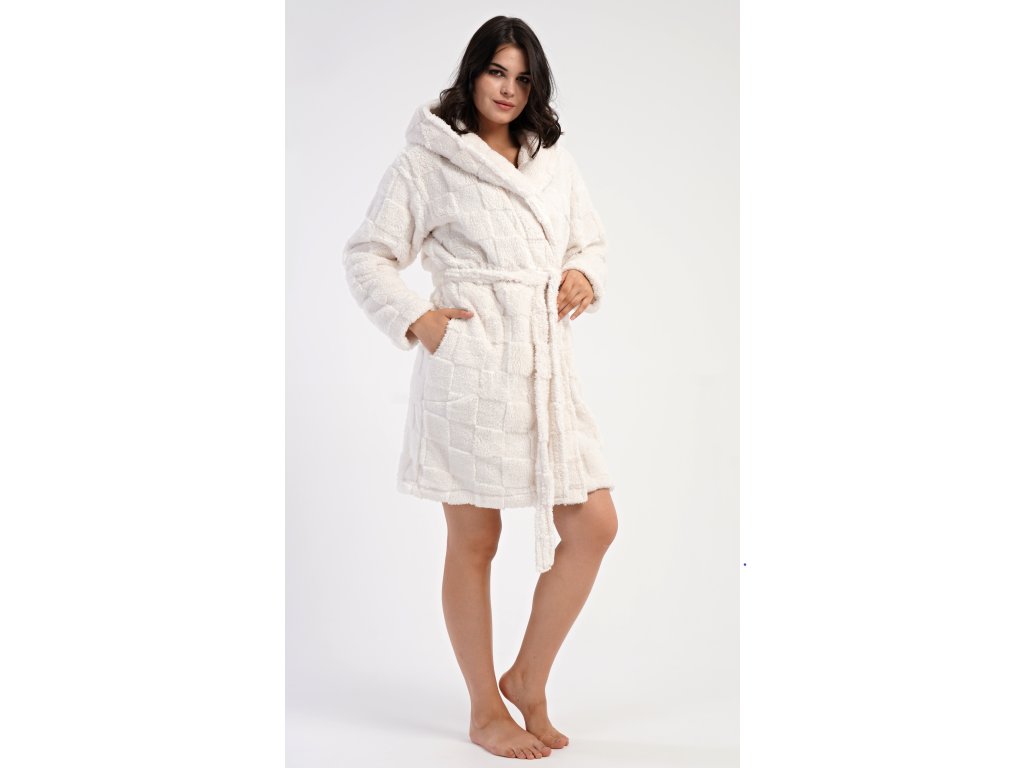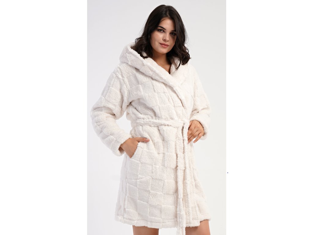 Dámsky krátky softový župan s kapucňou Karolína. Župan má kapucňu, praktické vrecká a opasok na stiahnutie. Je zdobený jemnou kockou. Župan Vás zahreje cestou z kúpeľne aj pri leňošení na gauči, bude to Váš milý spoločník v chladných dňoch. Použitý softový materiál je jemný a poddajný na dotyk.