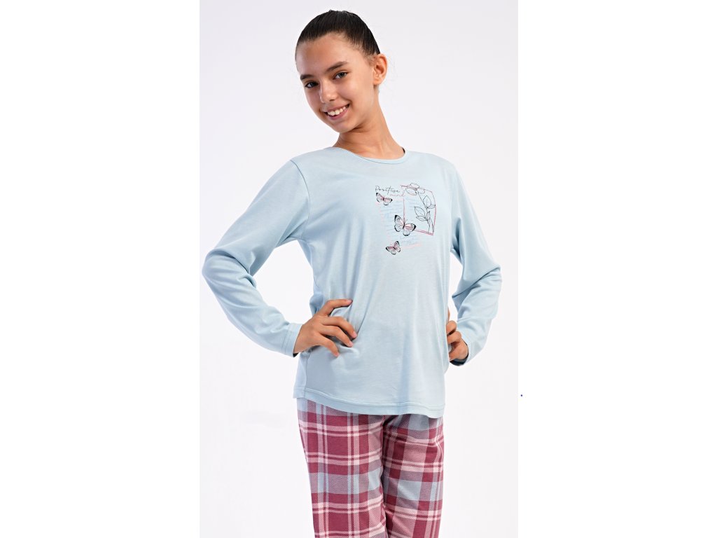 Detské bavlnené dlhé pyžamo Charlotte. Dievčenské pyžamo sa skladá z trička s dlhým rukávom a dlhých nohavíc. Tričko s okrúhlym výstrihom je ozdobené obrázkami motýľov. Kárované nohavice majú v páse gumu a šnúrku na stiahnutie, nemajú vrecká. Použitý bavlnený materiál je poddajný a príjemný na dotyk.
