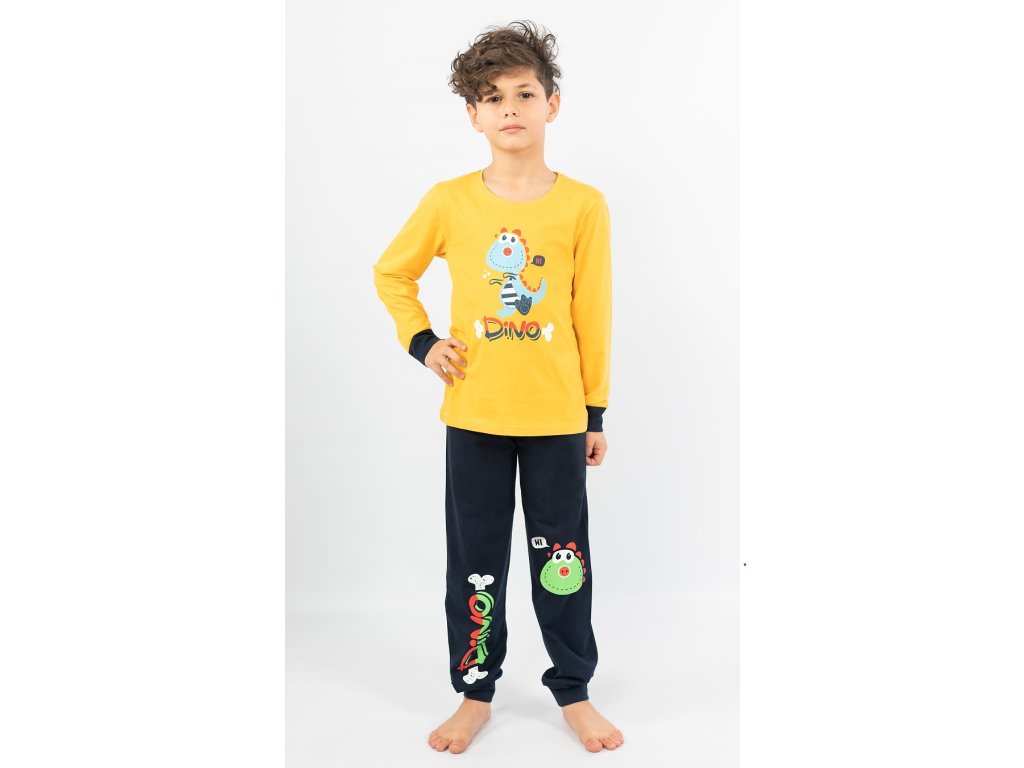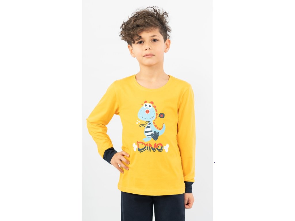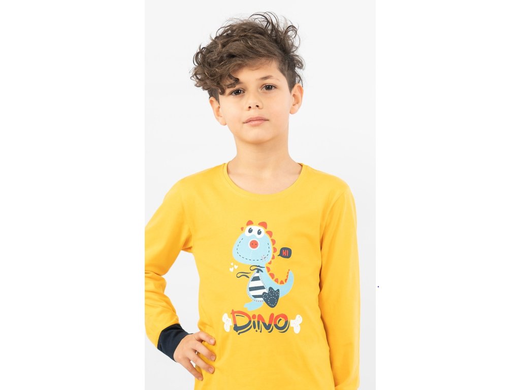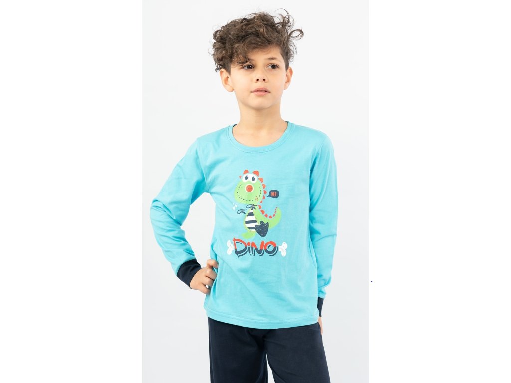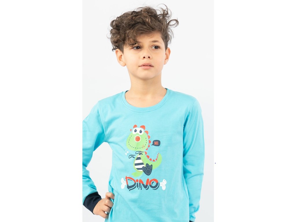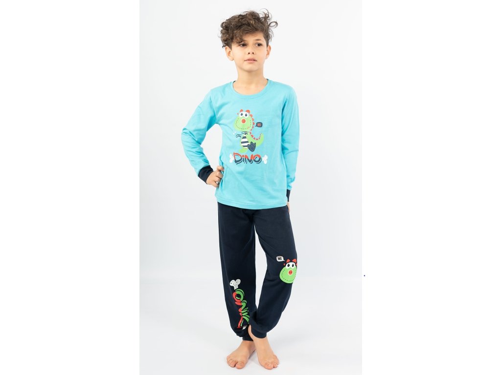 Detské bavlnené pyžamo dlhé Dino. Detské pyžamo sa skladá z trička s dlhým rukávom a dlhých nohavíc. Na triku je obrázok dinosaura a nápis 'Dino'. Rovnaký motív sa opakuje aj na dlhých jednofarebných nohaviciach, ktoré sú rovnako ako tričko zakončené pántami. Nohavice majú v páse gumu, nemajú vrecká. Použitý bavlnený materiál je príjemný a poddajný na dotyk.