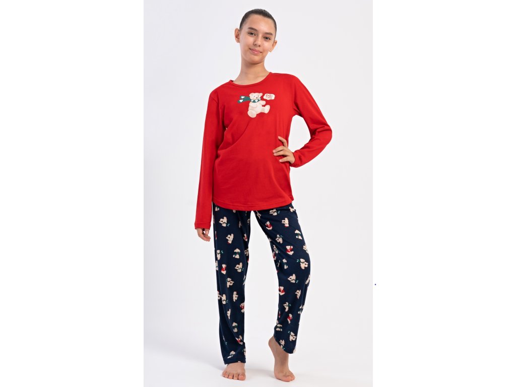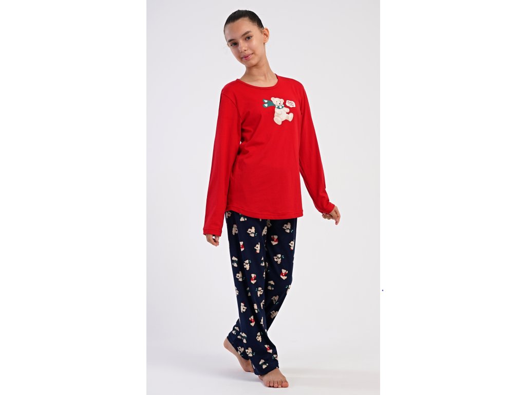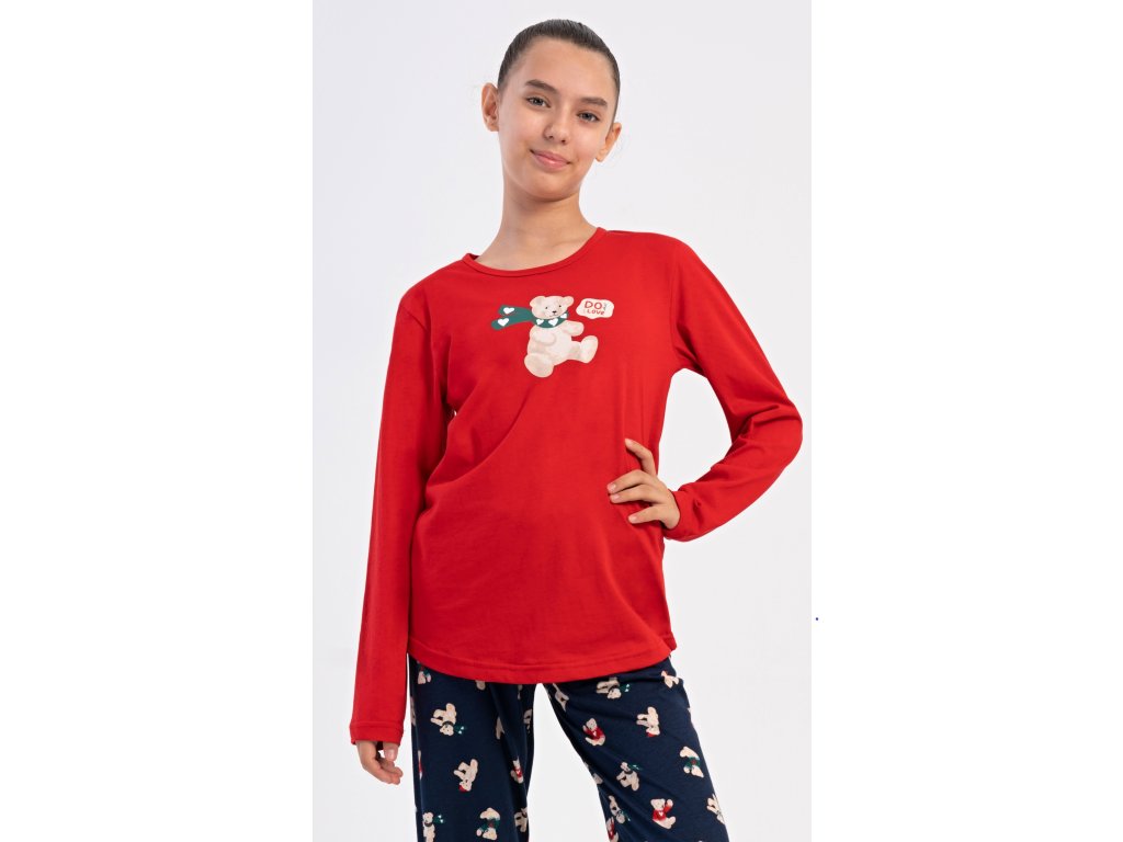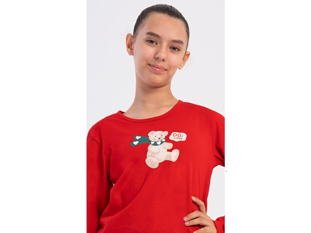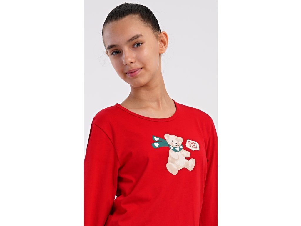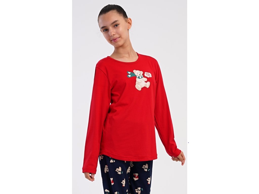 Detské bavlnené dlhé pyžamo Méďa so šálom. Dievčenské pyžamo sa skladá z trička s dlhým rukávom a dlhých nohavíc. Tričko s okrúhlym výstrihom je ozdobené obrázkom plyšového medveďa. Tento motív sa opakuje aj na nohaviciach, ktoré majú v páse gumu a šnúrku na stiahnutie, nemajú vrecká. Použitý bavlnený materiál je poddajný a príjemný na dotyk.