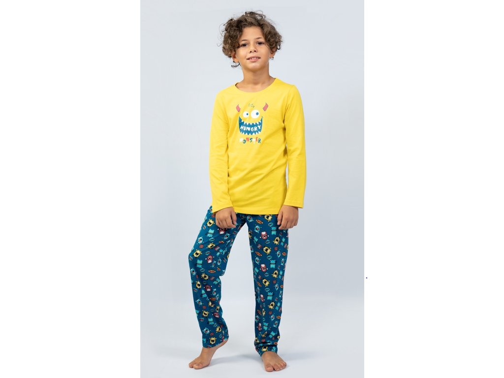 Detské bavlnené pyžamo dlhé Monster. Detské pyžamo sa skladá z trička s dlhým rukávom a dlhých nohavíc. Na triku je obrázok rozosmiatej hladnej príšerky, podobný motív sa opakuje aj na dlhých nohaviciach. Použitý bavlnený materiál je príjemný a poddajný na dotyk.