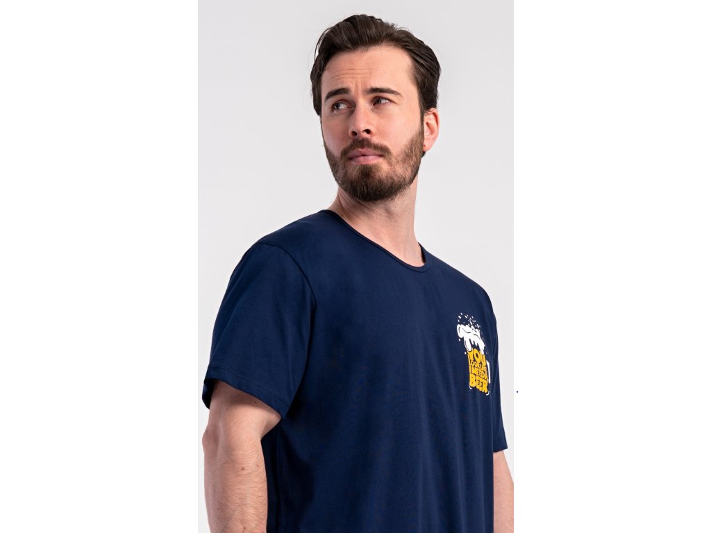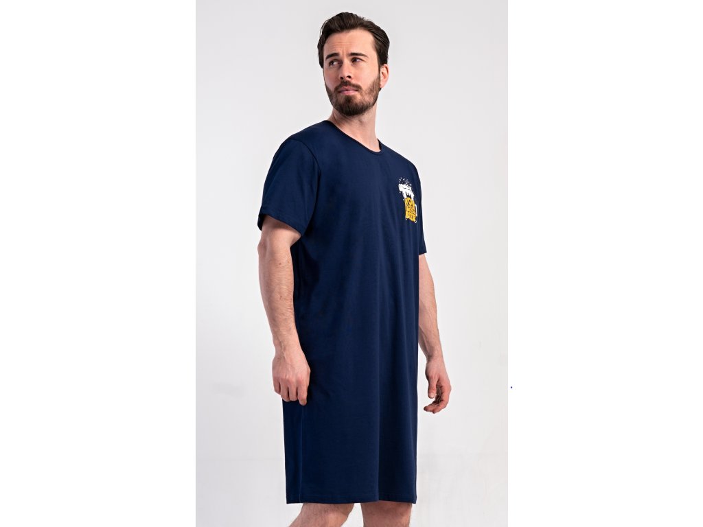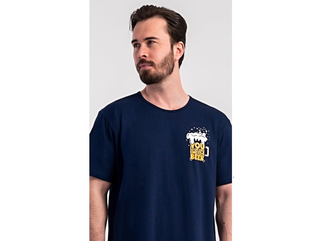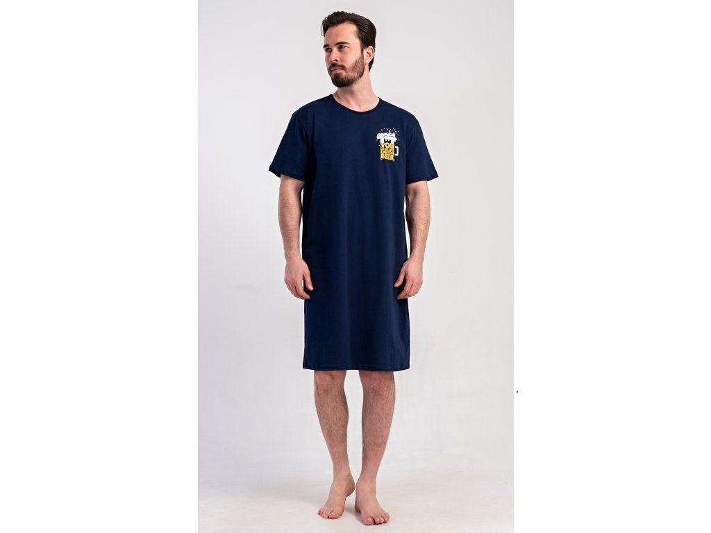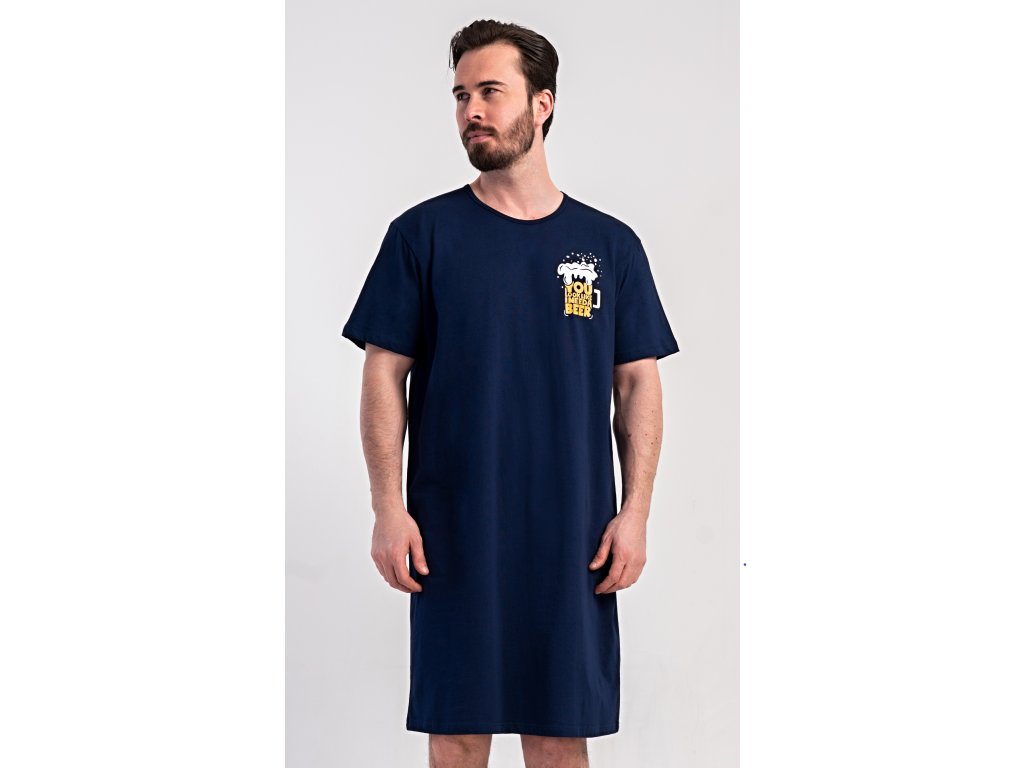 Pánska bavlnená nočná košeľa s krátkym rukávom Pivo. Jednofarebná pánska nočná košeľa s okrúhlym výstrihom a dĺžkou po kolená má na hrudi obrázok pollitra piva. Nočná košeľa je vhodným darčekom pre všetkých milovníkov piva. Použitý materiál s obsahom bavlny 100% je príjemný a poddajný na dotyk.