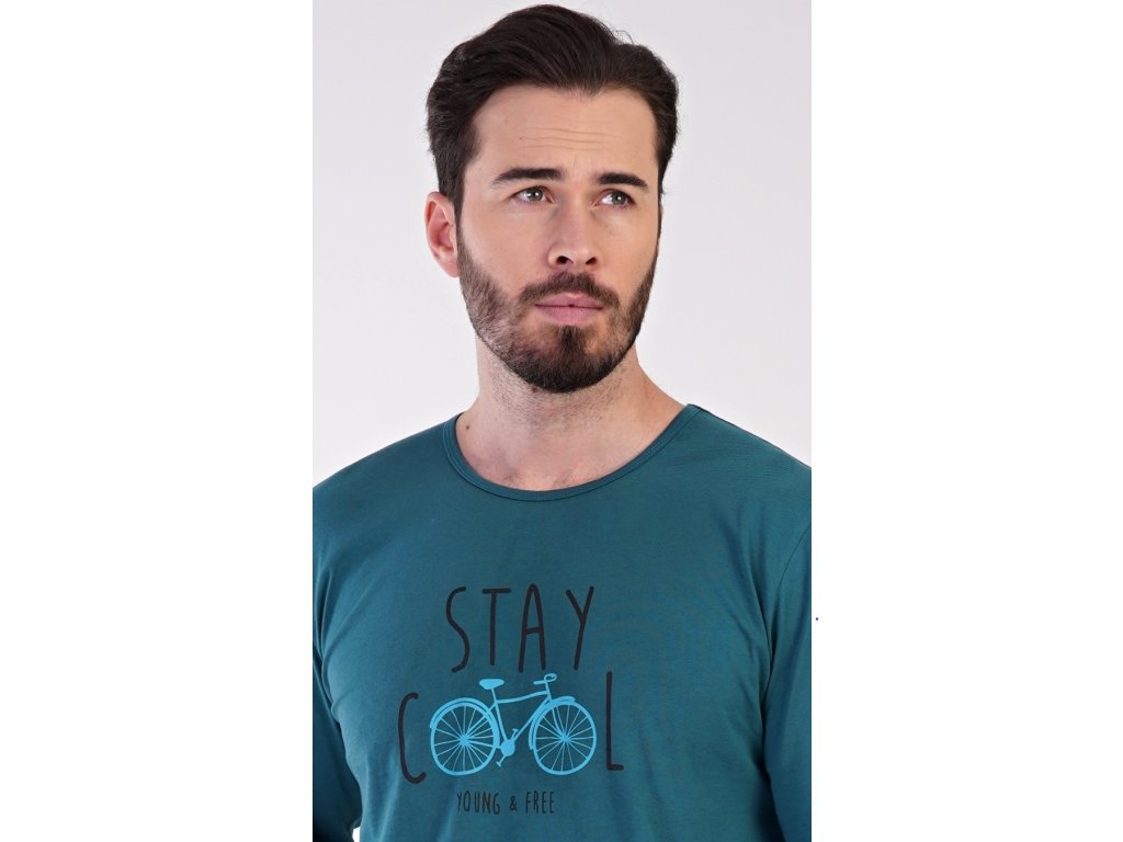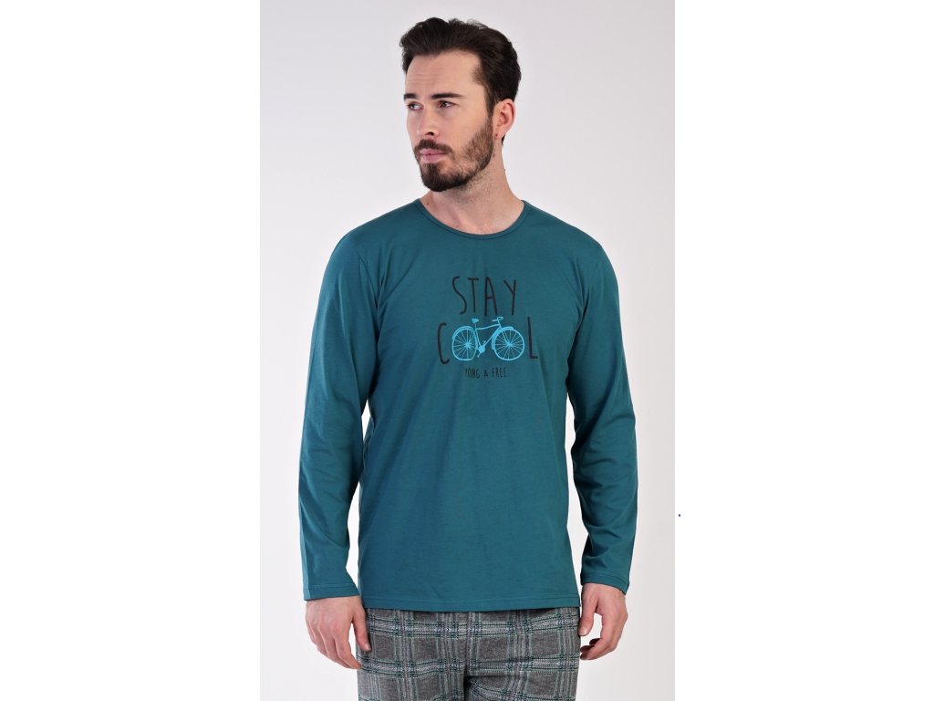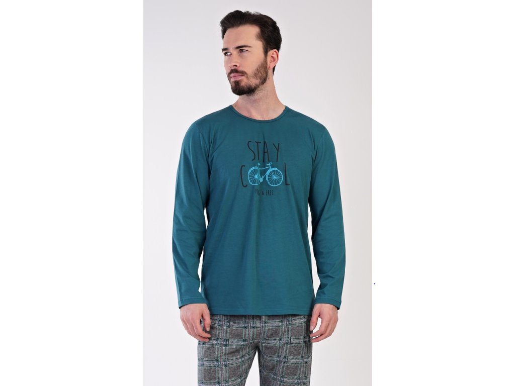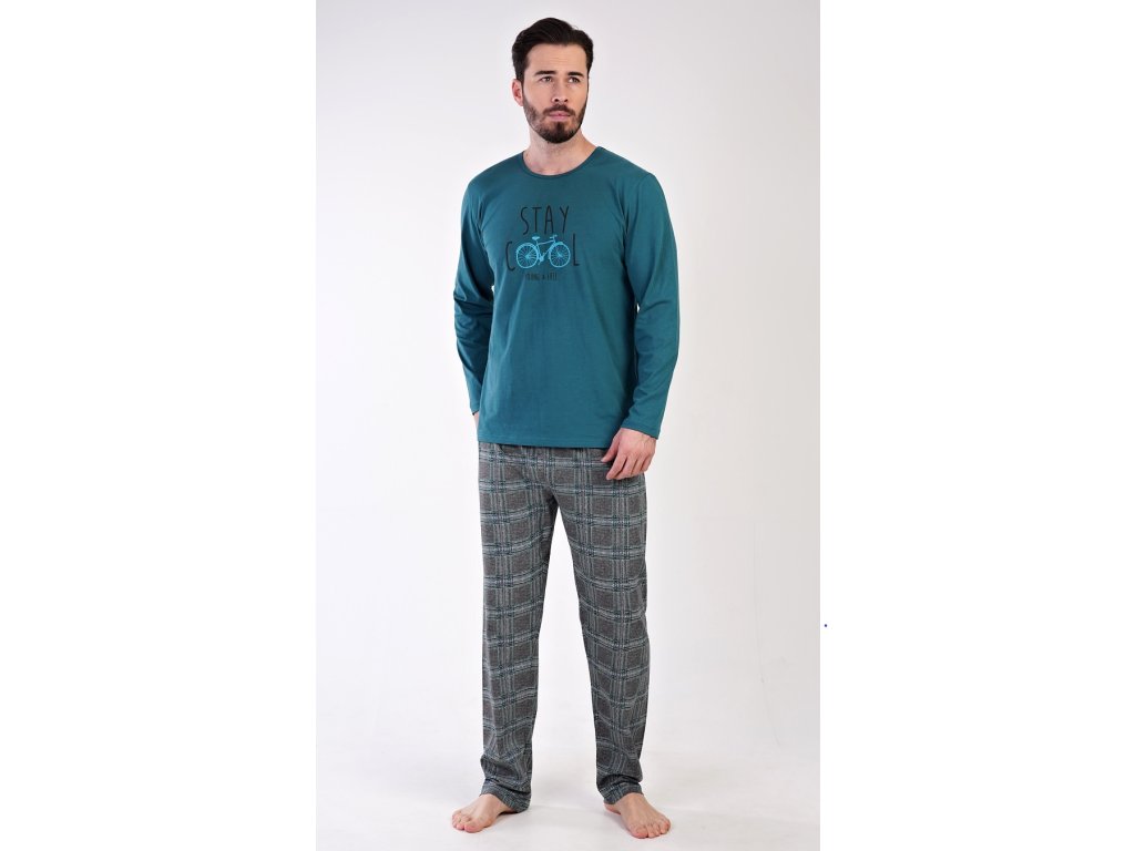 Pánske bavlnené pyžamo dlhé Adam. Pánske pyžamo sa skladá z trička s dlhým rukávom a dlhých nohavíc. Jednofarebné tričko s okrúhlym výstrihom je zdobené obrázkom bicykla a nápisom 'Stay cool, young and free'. Kockované nohavice majú v páse gumu a šnúrku na stiahnutie. Nemajú vrecká. Použitý materiál je príjemný a poddajný na dotyk. Podiel bavlny nohavíc aj trička je 100%.