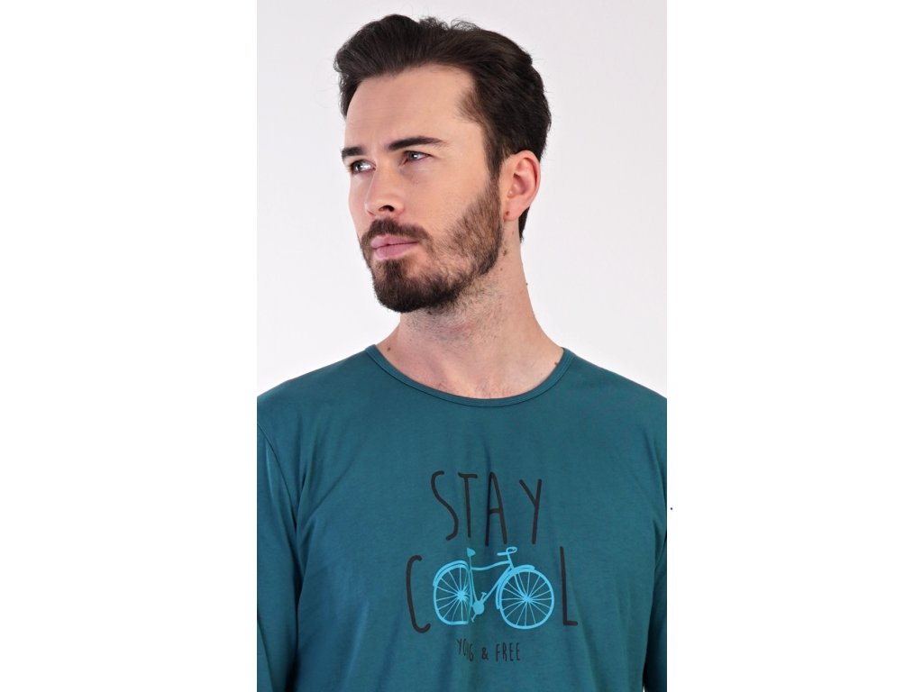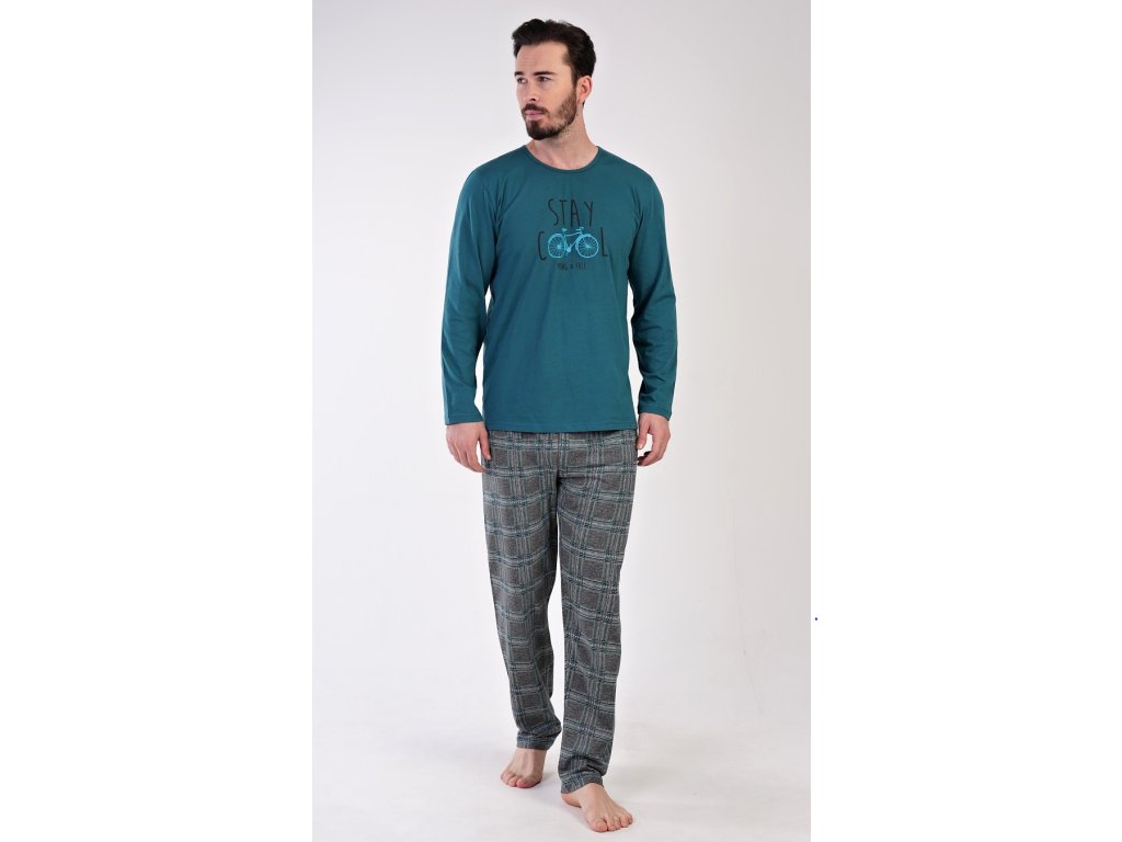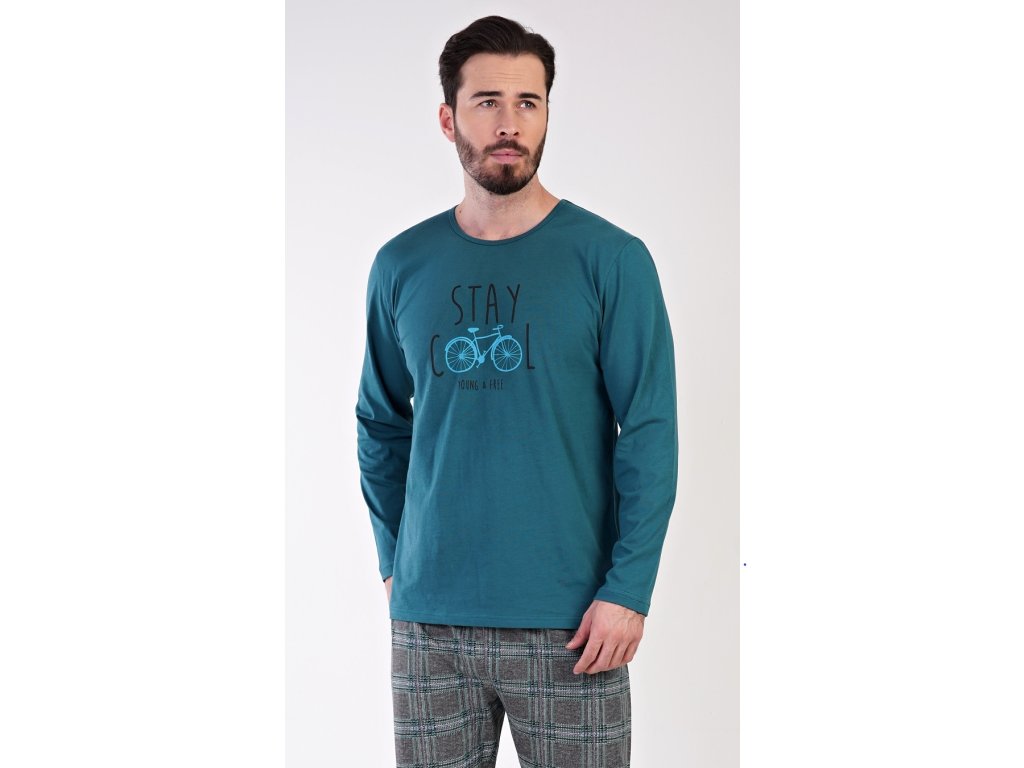Pánske bavlnené pyžamo dlhé Adam. Pánske pyžamo sa skladá z trička s dlhým rukávom a dlhých nohavíc. Jednofarebné tričko s okrúhlym výstrihom je zdobené obrázkom bicykla a nápisom 'Stay cool, young and free'. Kockované nohavice majú v páse gumu a šnúrku na stiahnutie. Nemajú vrecká. Použitý materiál je príjemný a poddajný na dotyk. Podiel bavlny nohavíc aj trička je 100%.