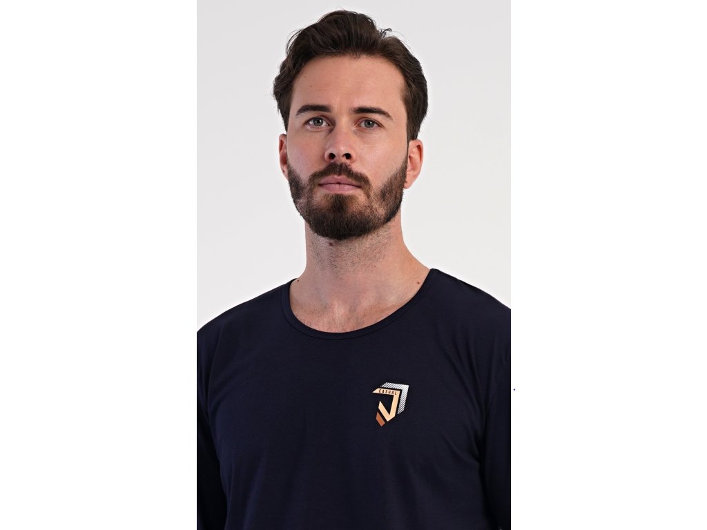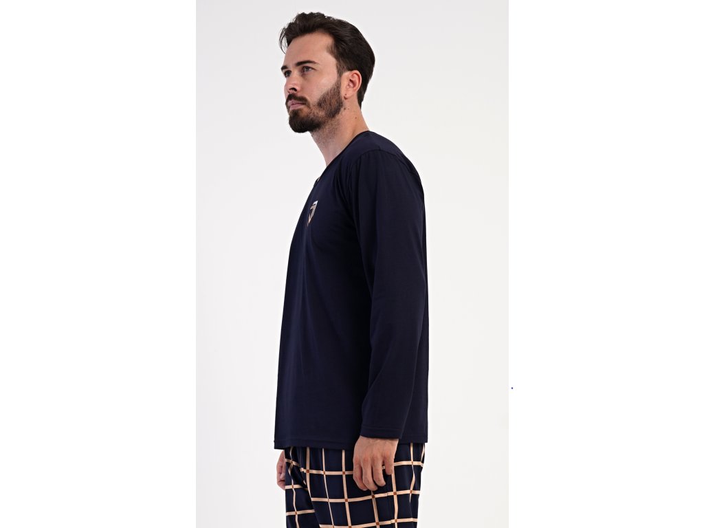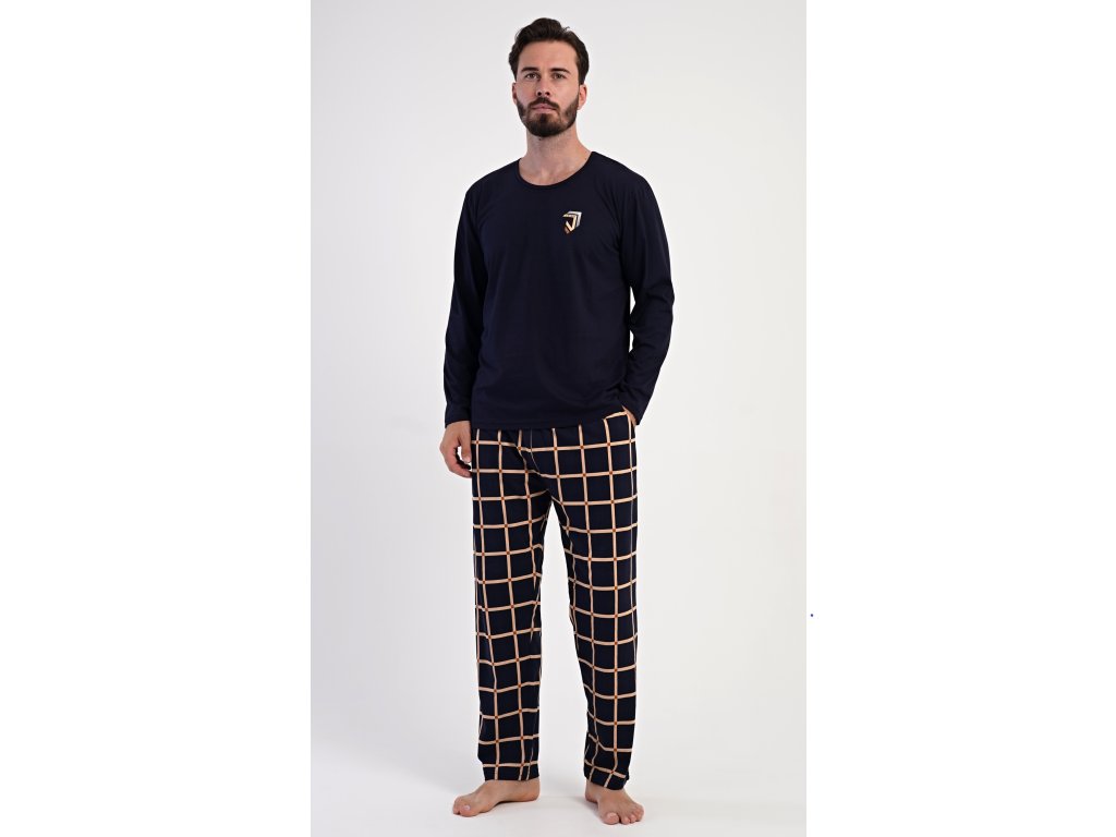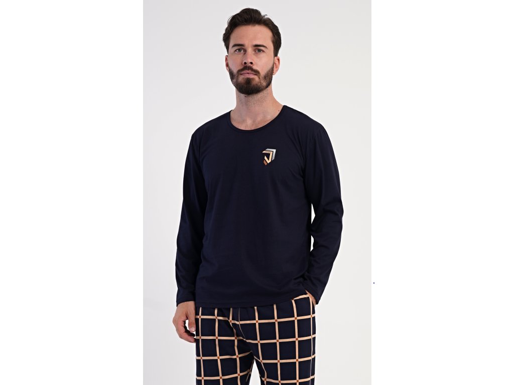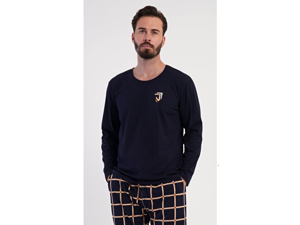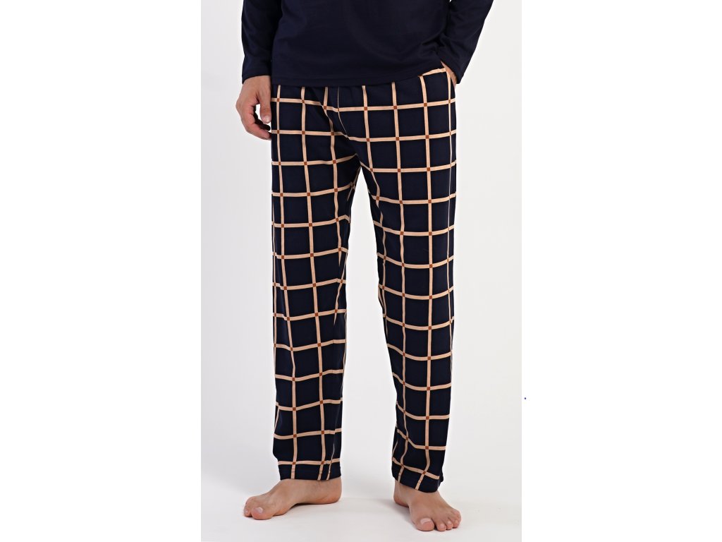 Pánske dlhé bavlnené pyžamo Alfréd. Pánske pyžamo sa skladá z trička s dlhým rukávom a dlhých nohavíc. Tričko je jednofarebné, zdobené na hrudi drobným obrázkom. Kockované nohavice majú v páse gumu, šnúrku na stiahnutie a praktické vrecká. Použitý materiál s obsahom bavlny 100% je poddajný a príjemný na dotyk.