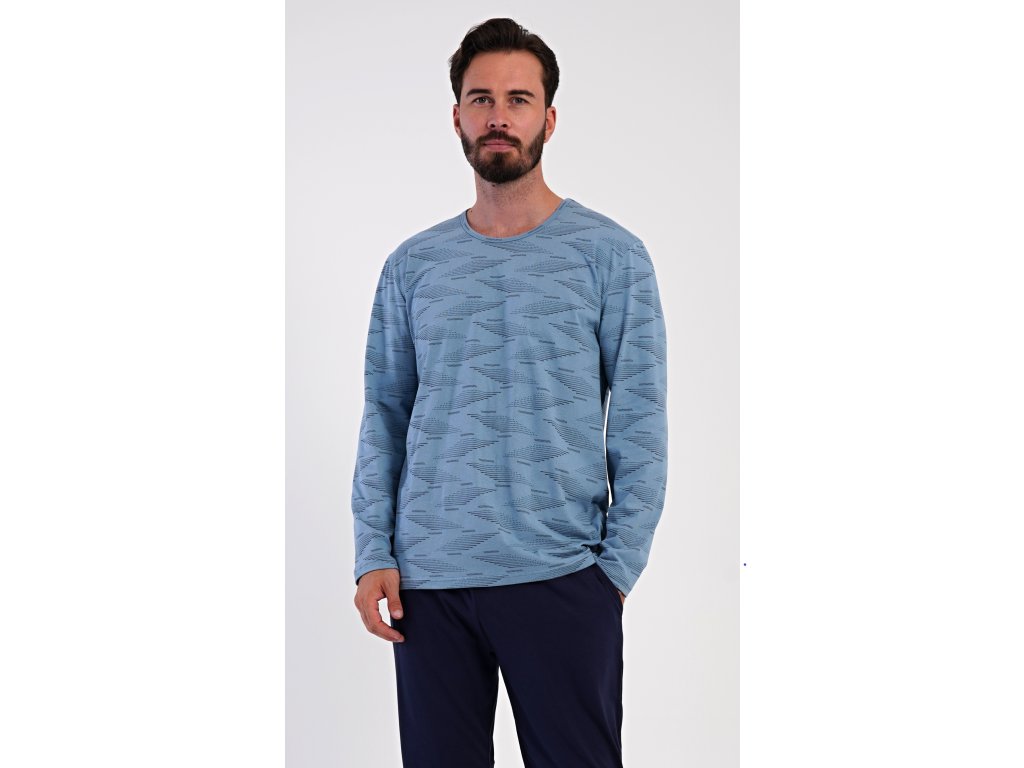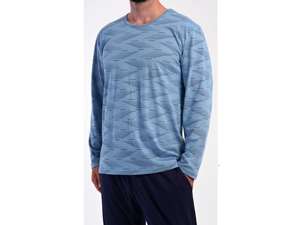 Pánske dlhé bavlnené pyžamo Arnošt. Pánske pyžamo sa skladá z trička s dlhým rukávom a dlhých nohavíc. Tričko s okrúhlym výstrihom je potlačené geometrickým vzorom. Jednofarebné nohavice majú v páse gumu, šnúrku na stiahnutie a praktické vrecká. Použitý materiál s obsahom bavlny 100% je poddajný a príjemný na dotyk.