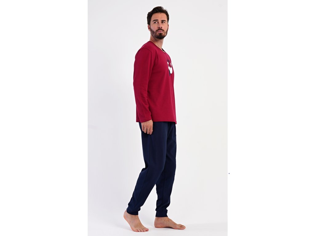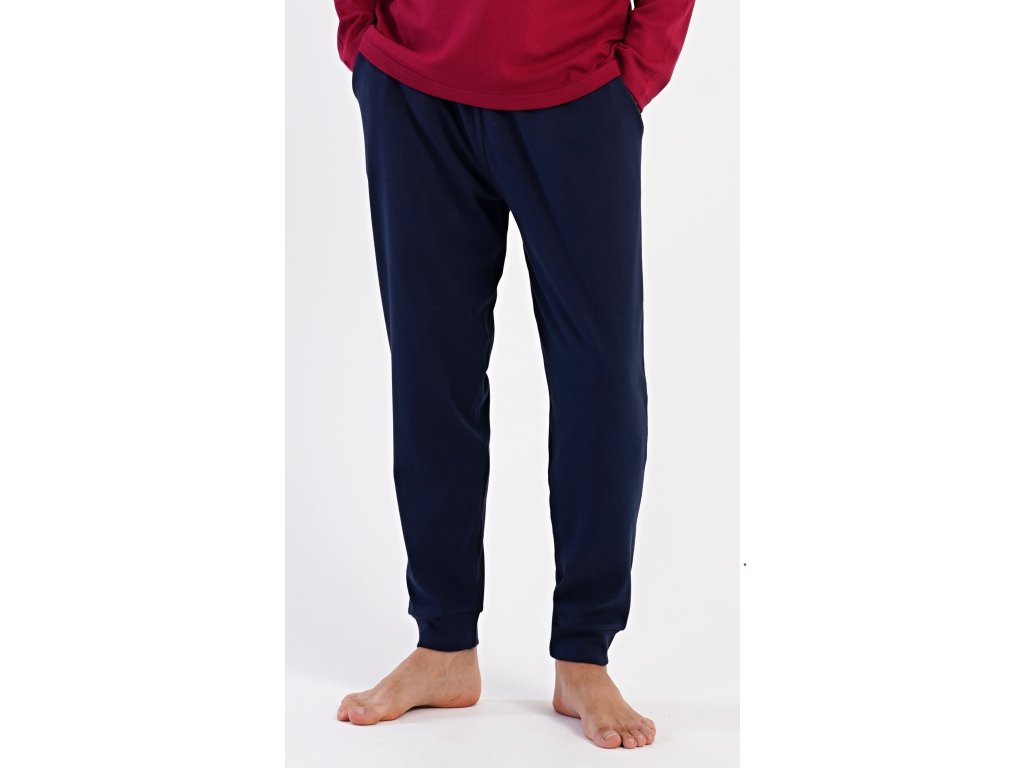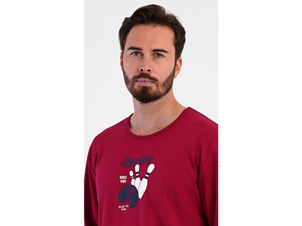 Pánske dlhé bavlnené pyžamo Bowling. Pánske pyžamo sa skladá z trička s dlhým rukávom a dlhých nohavíc zakončených lemy. Tričko s okrúhlym výstrihom zdobí na hrudi obrázok kolkov a nápis BOWLING. Jednofarebné nohavice majú v páse gumu, šnúrku na stiahnutie a praktické vrecká. Použitý materiál INTERLOK s obsahom bavlny 100% je poddajný a príjemný na dotyk.