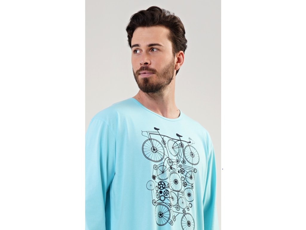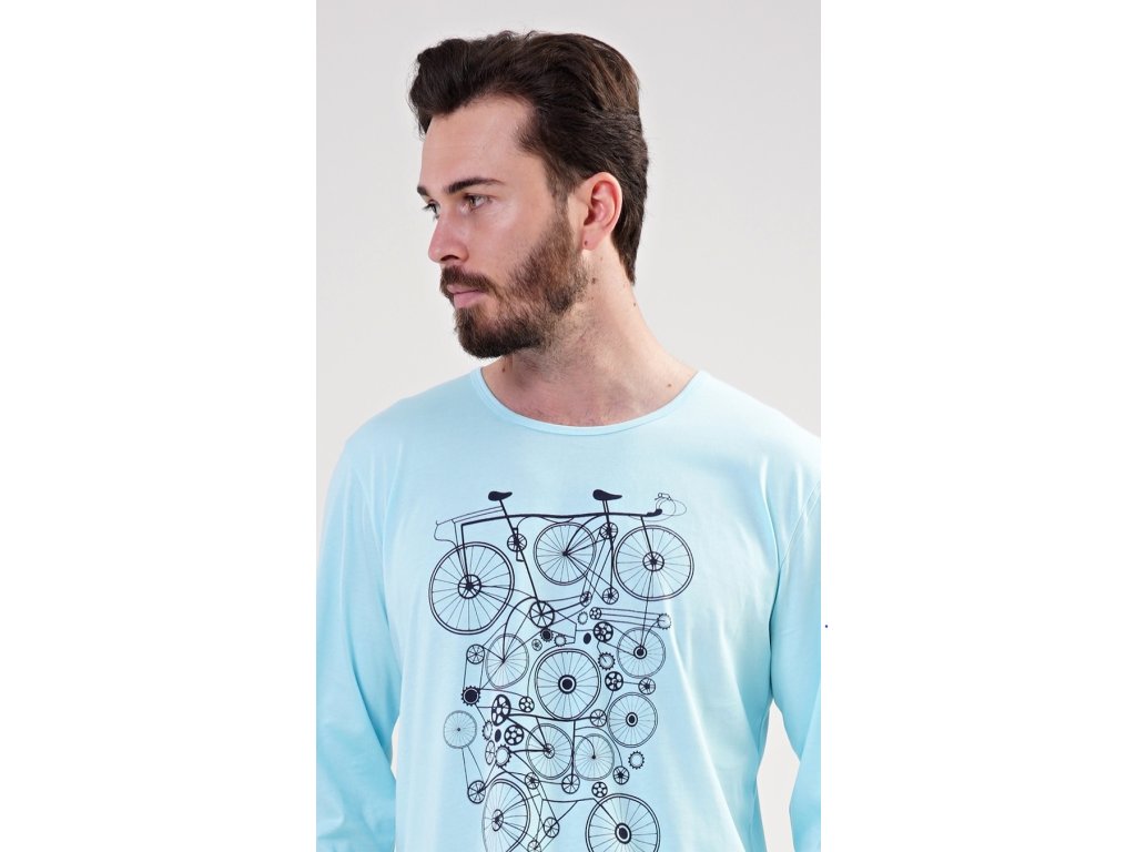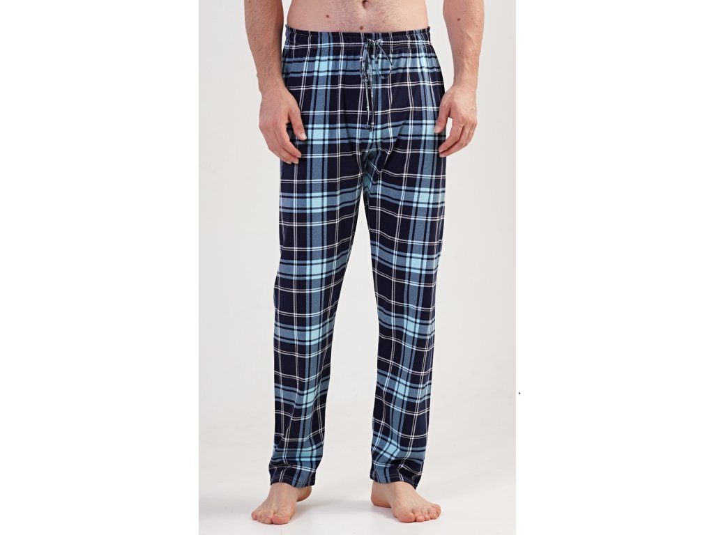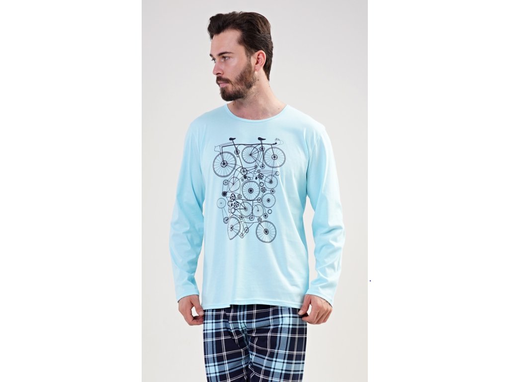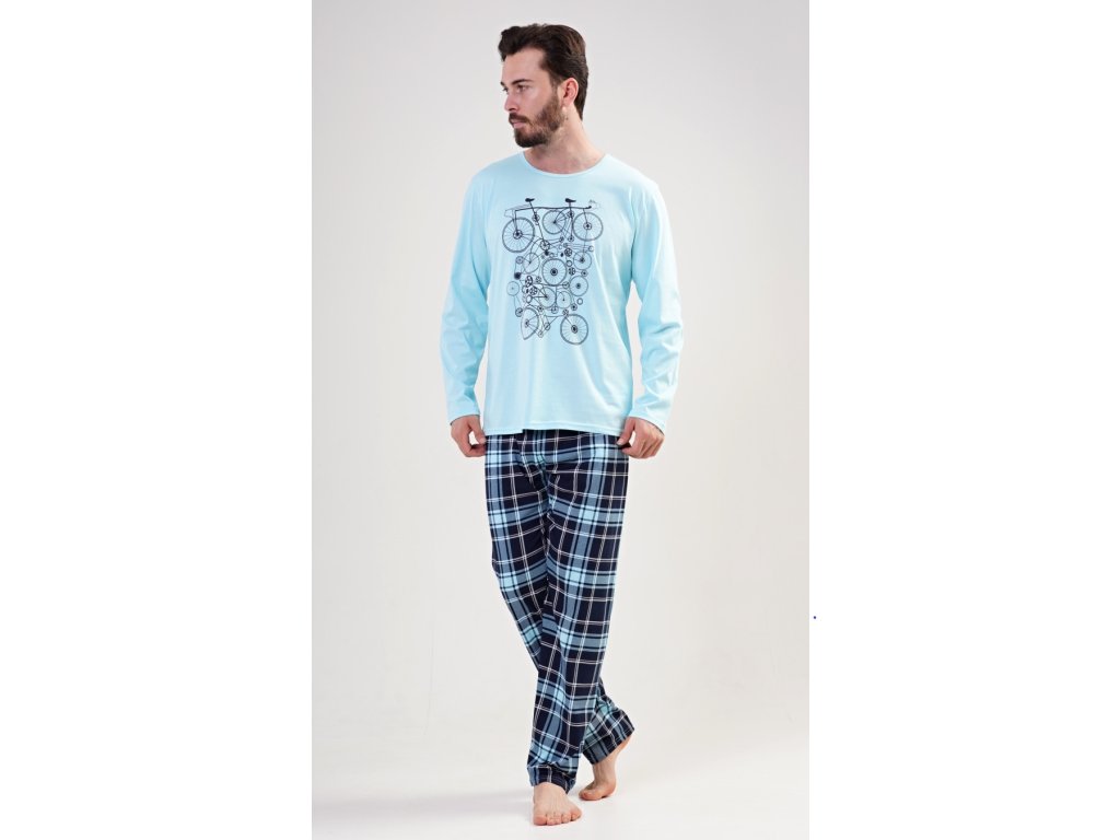 Pánske bavlnené pyžamo dlhé Koleso. Pánske pyžamo sa skladá z trička s dlhým rukávom a dlhých nohavíc. Na jednofarebnom triku je veľký obrázok niekoľkých prepletených kolies. Výraznú potlač trička vhodne dopĺňajú kárované nohavice bez vreciek. Nohavice majú v páse gumu a šnúrku na stiahnutie. Použitý bavlnený materiál je príjemný a poddajný na dotyk.