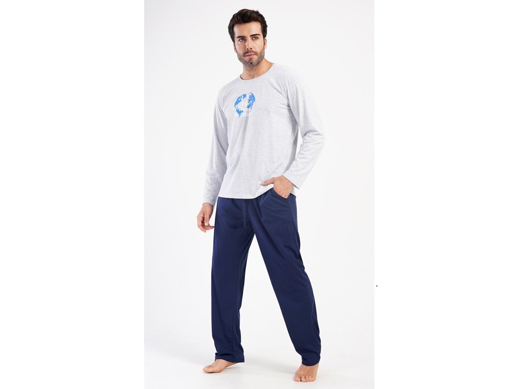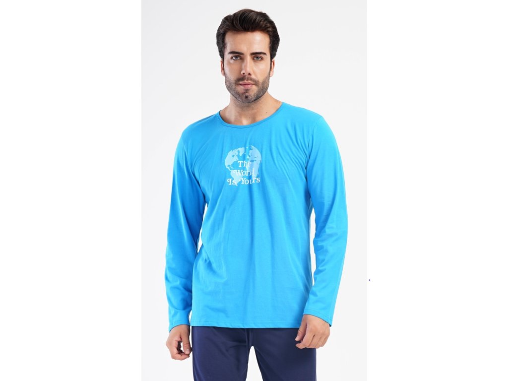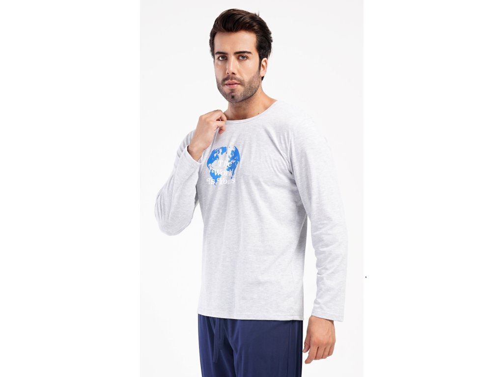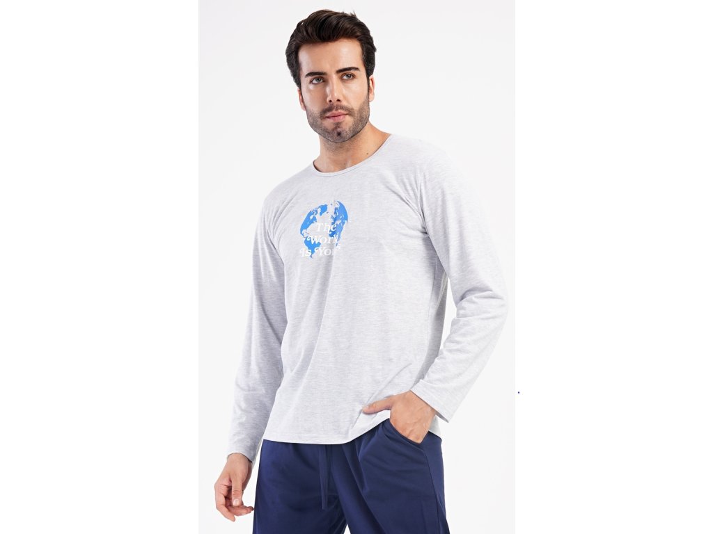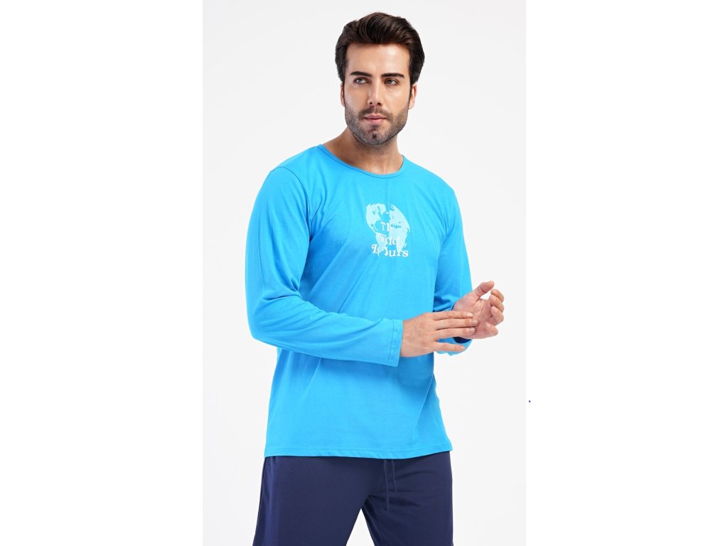 Pánske dlhé bavlnené pyžamo Matej. Pánske pyžamo sa skladá z trička s dlhým rukávom a dlhých nohavíc. Tričko s okrúhlym výstrihom je jednofarebné, zdobené na hrudi obrázkom zemegule a nápisom 'The world is yours'. Jednofarebné nohavice majú v páse gumu, šnúrku na stiahnutie a praktické vrecká. Použitý materiál je poddajný a príjemný na dotyk. Obsah bavlny u nohavíc a modrého trička je 100%, iba u šedého trička 70%.