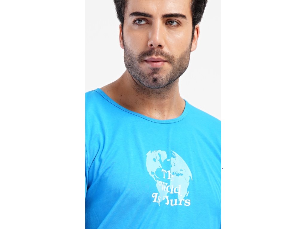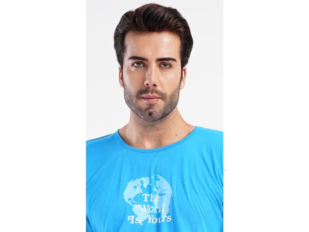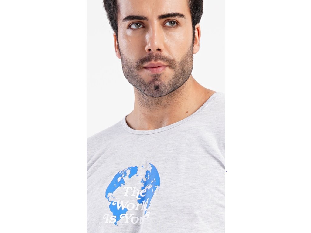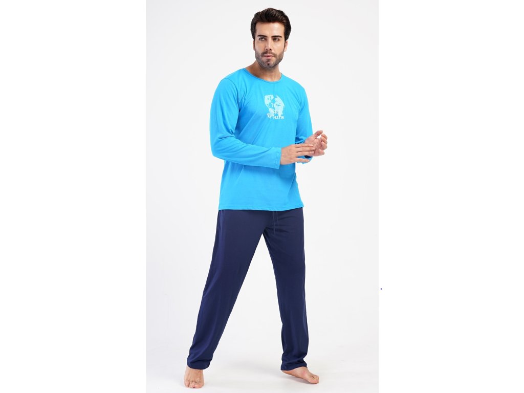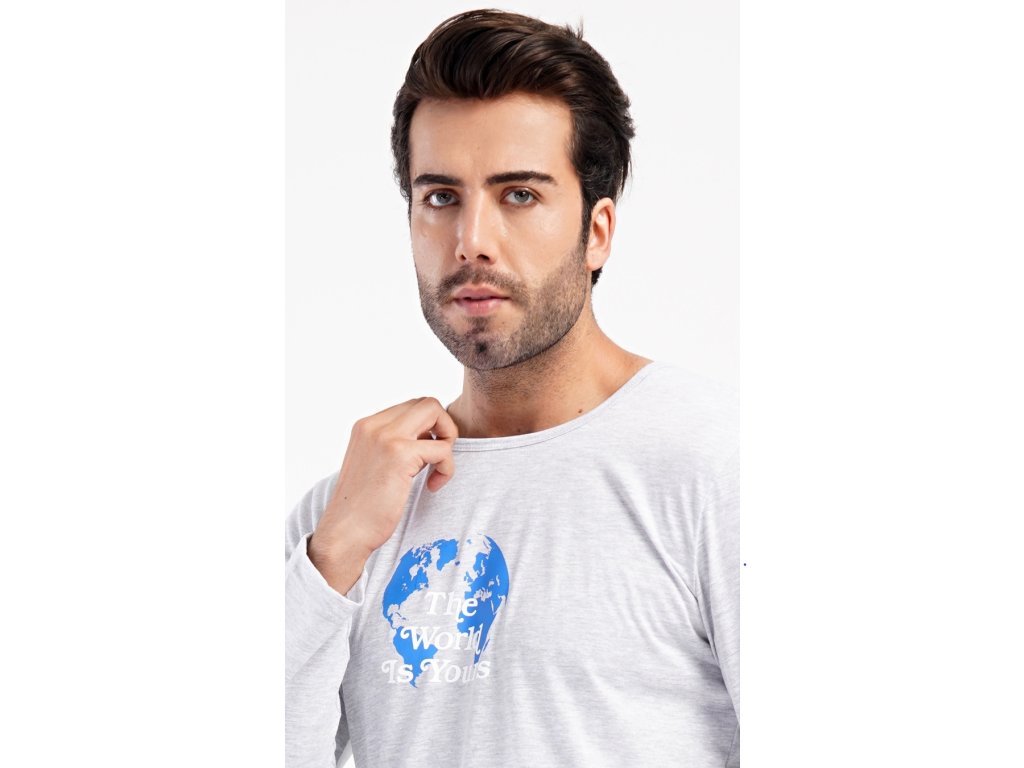 Pánske dlhé bavlnené pyžamo Matej. Pánske pyžamo sa skladá z trička s dlhým rukávom a dlhých nohavíc. Tričko s okrúhlym výstrihom je jednofarebné, zdobené na hrudi obrázkom zemegule a nápisom 'The world is yours'. Jednofarebné nohavice majú v páse gumu, šnúrku na stiahnutie a praktické vrecká. Použitý materiál je poddajný a príjemný na dotyk. Obsah bavlny u nohavíc a modrého trička je 100%, iba u šedého trička 70%.