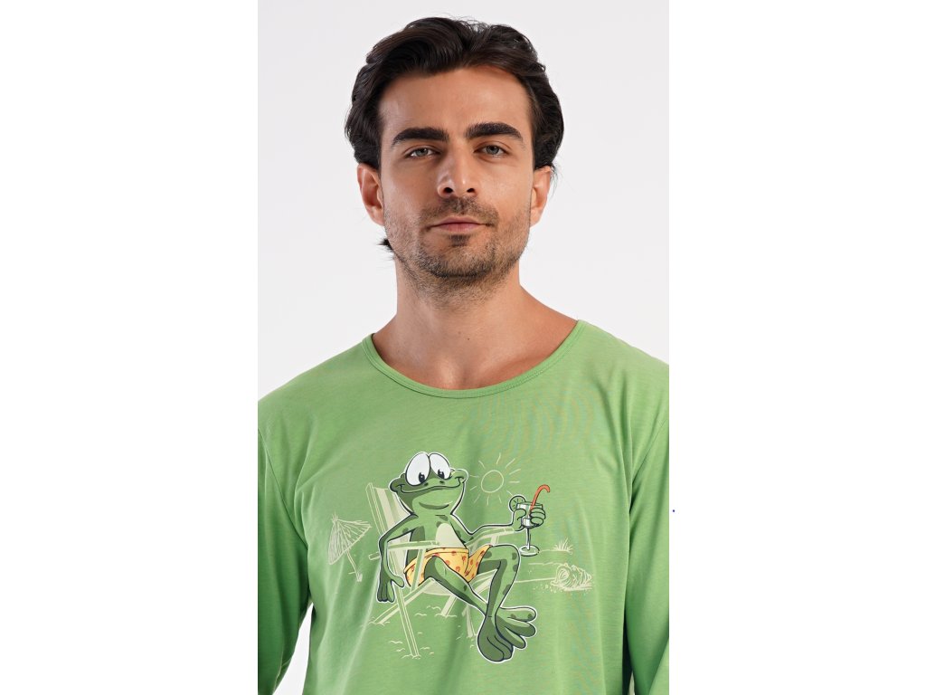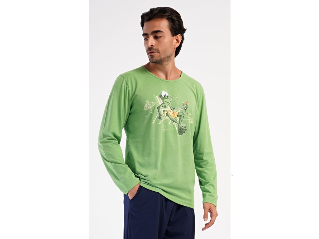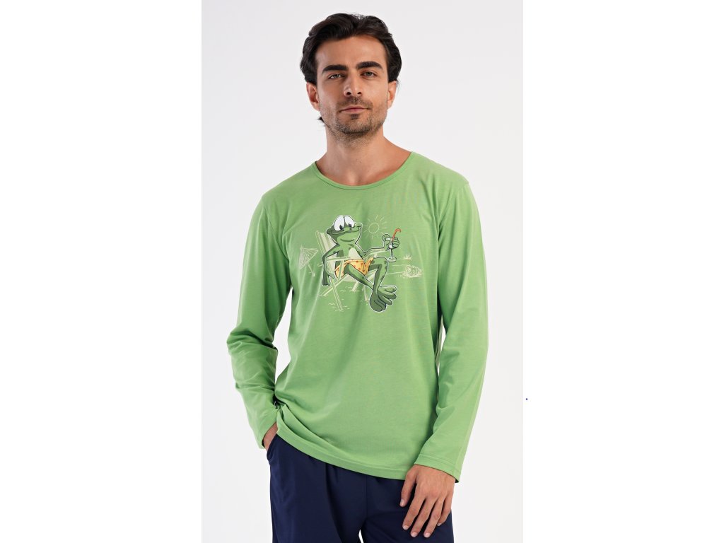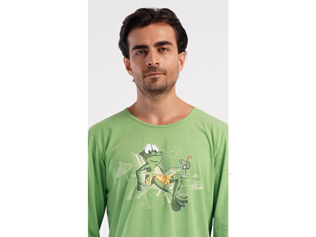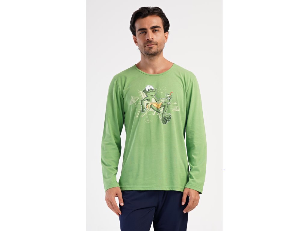 Pánske dlhé bavlnené pyžamo No stress. Pánske pyžamo sa skladá z trička s dlhým rukávom a dlhých nohavíc, ktoré sú zakončené lemy. Tričko s okrúhlym výstrihom zdobí na hrudi obrázok žabiaka. Jednofarebné nohavice majú v páse gumu, šnúrku na stiahnutie a praktické vrecká. Použitý materiál s obsahom bavlny 100% je poddajný a príjemný na dotyk.