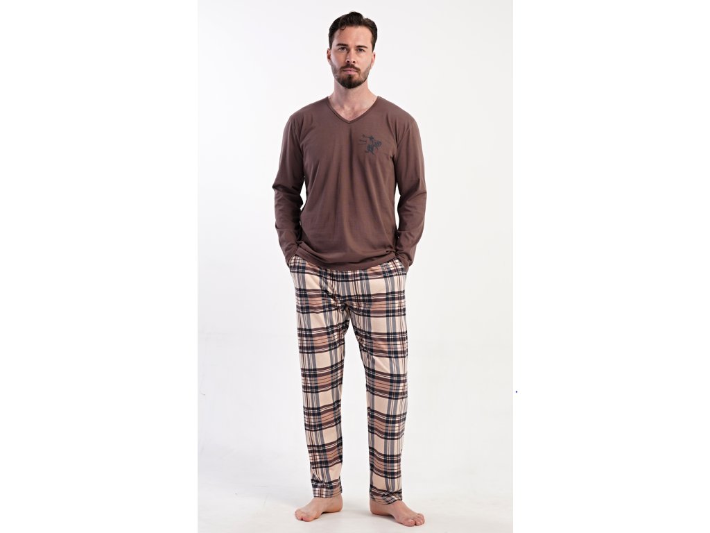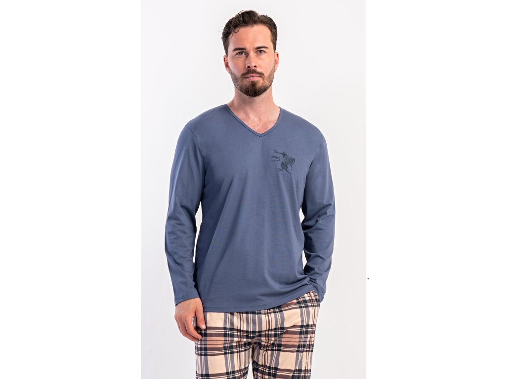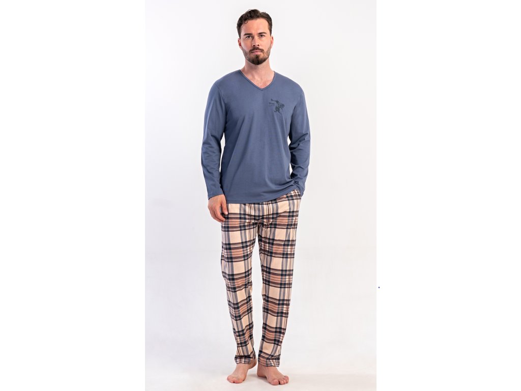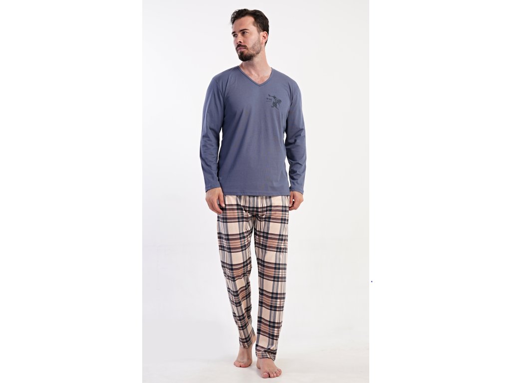 Pánske dlhé bavlnené pyžamo Paul. Pánske pyžamo sa skladá z trička s dlhým rukávom a dlhých nohavíc. Tričko je jednofarebné, zdobené na hrudi drobným obrázkom. Kockované nohavice majú v páse gumu, šnúrku na stiahnutie a praktické vrecká. Použitý materiál s obsahom bavlny 100% je poddajný a príjemný na dotyk.