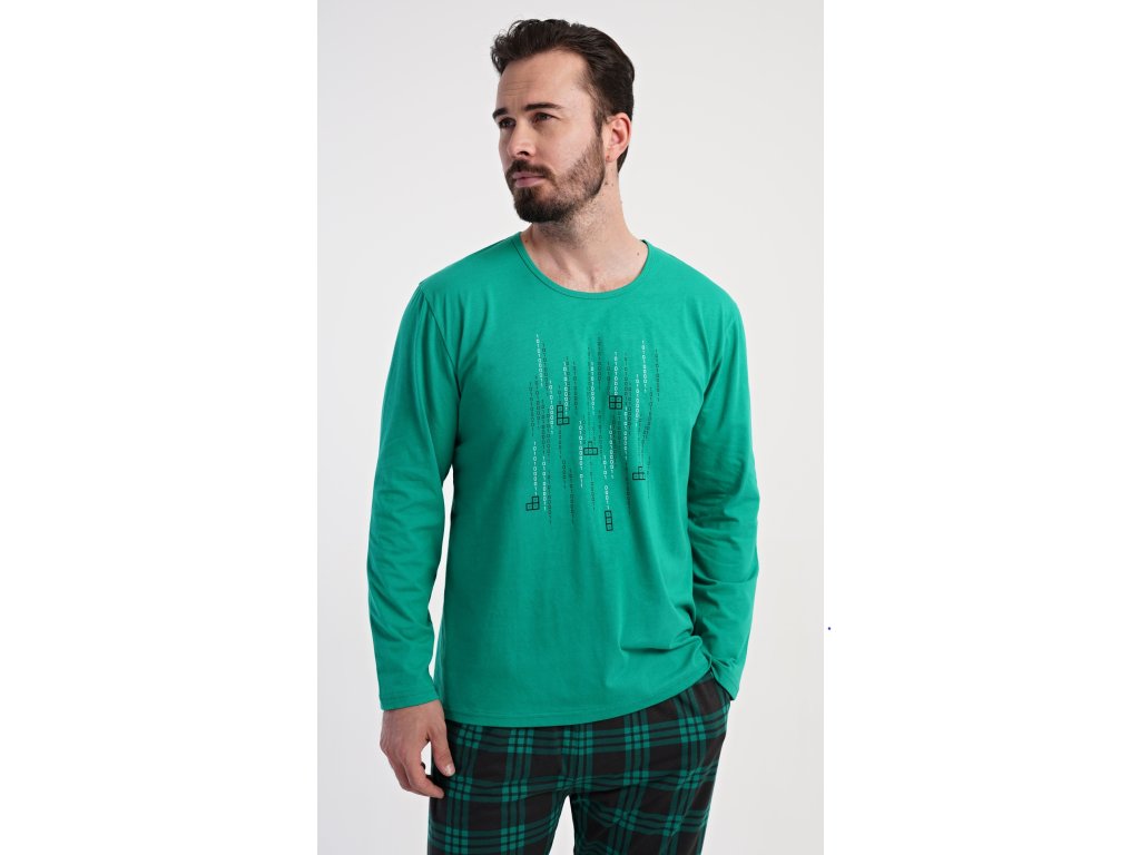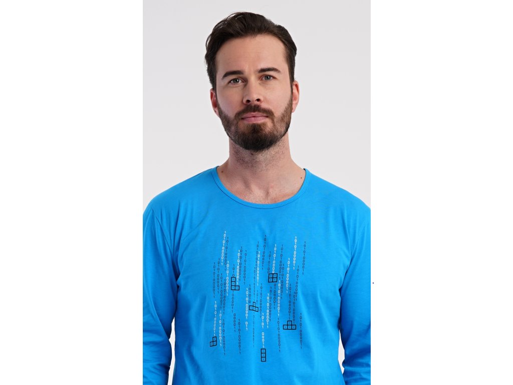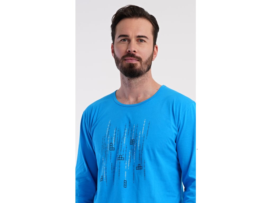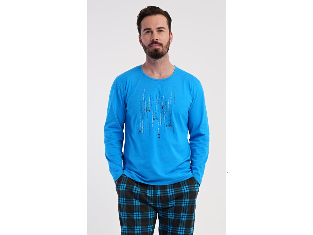 Pánske bavlnené pyžamo s dlhým rukávom Tetris. Pánske pyžamo sa skladá z trička s dlhým rukávom a dlhých nohavíc. Tričko s okrúhlym výstrihom zdobí na hrudi obrázok hry Tetris. Tričko dopĺňajú kárované nohavice, ktoré majú v páse gumu, šnúrku na stiahnutie a praktické vrecká. Použitý materiál s obsahom bavlny 100% je príjemný a poddajný na dotyk.