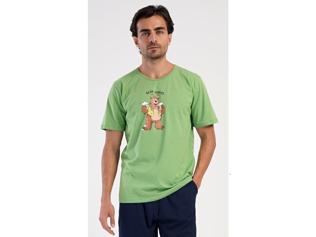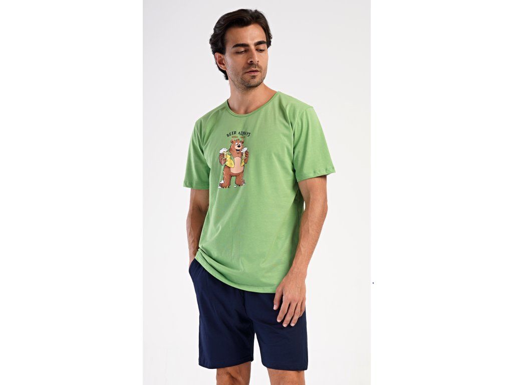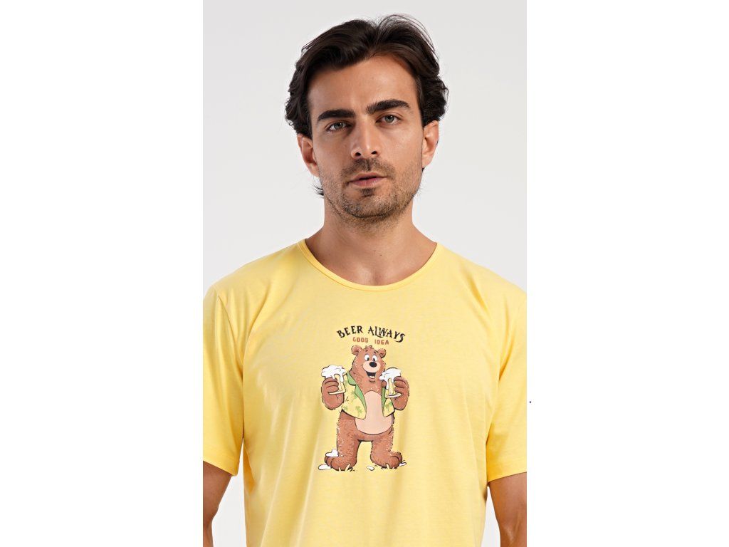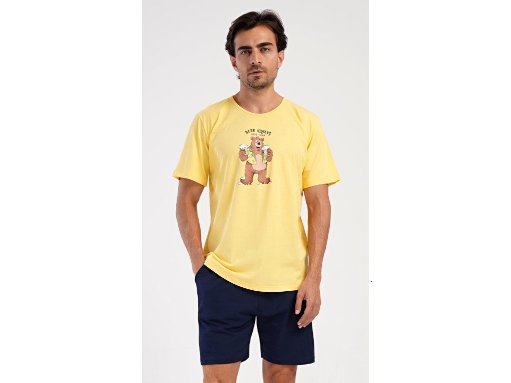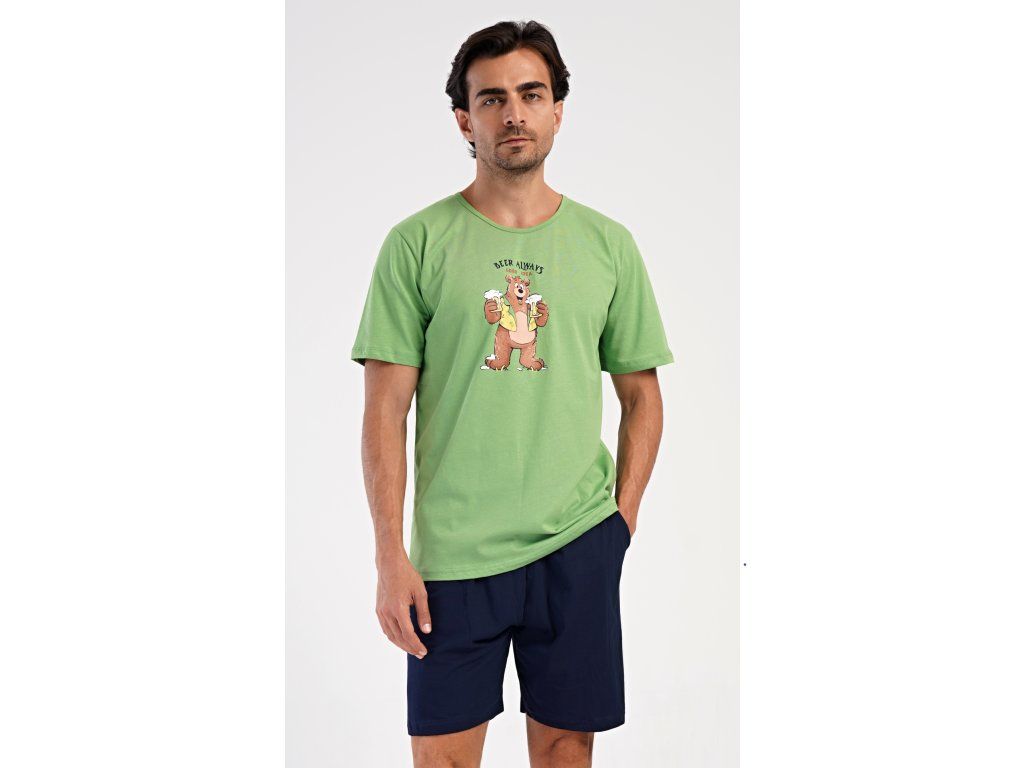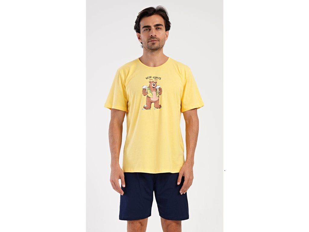 Pánske bavlnené šortkové pyžamo Beer always. Pánske pyžamo sa skladá z trička s krátkym rukávom a krátkych šortkových nohavíc. Na jednofarebnom tričku je obrázok medveďa s pivom a nápis 'Beer always'. Šortky majú praktické vrecká, v páse gumu a šnúrku na stiahnutie. Použitý materiál s podielom bavlny 100% je príjemný a poddaný na dotyk. Pyžamo oceníte obzvlášť v horúcich letných dňoch.