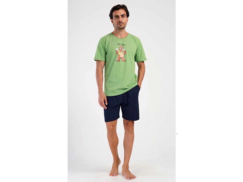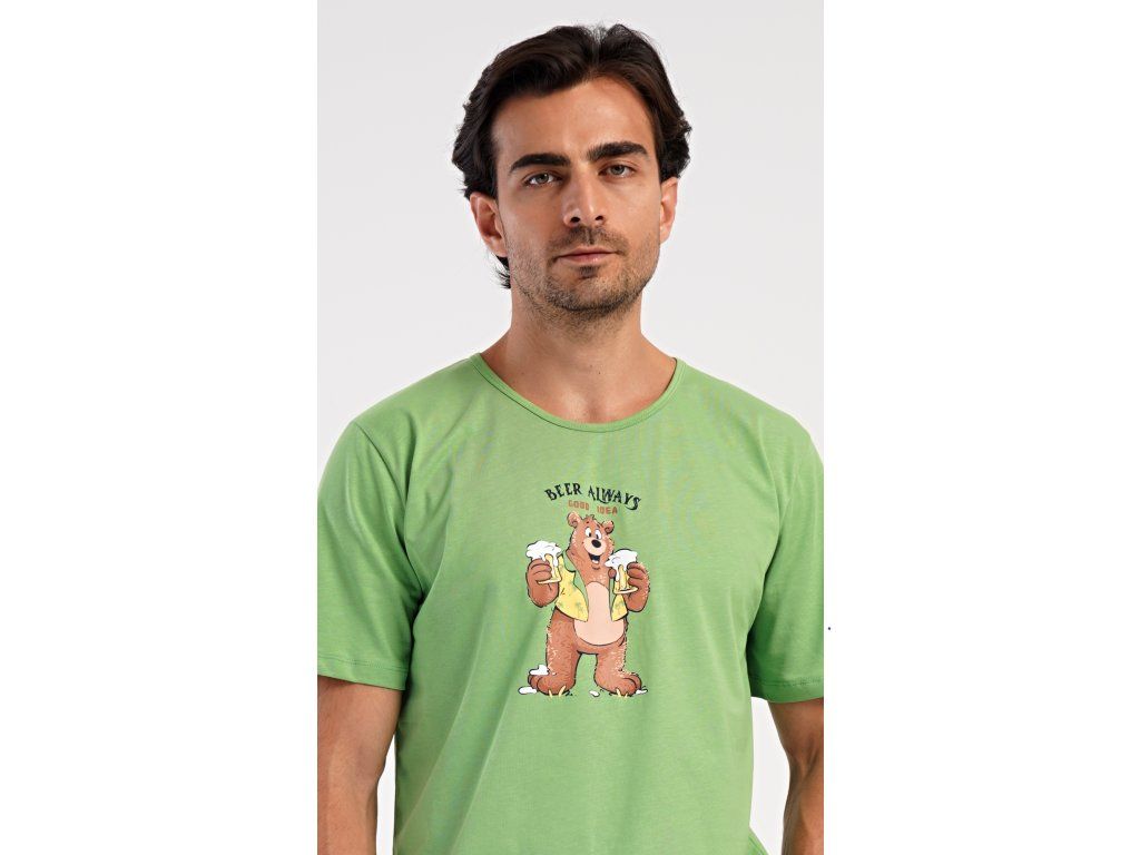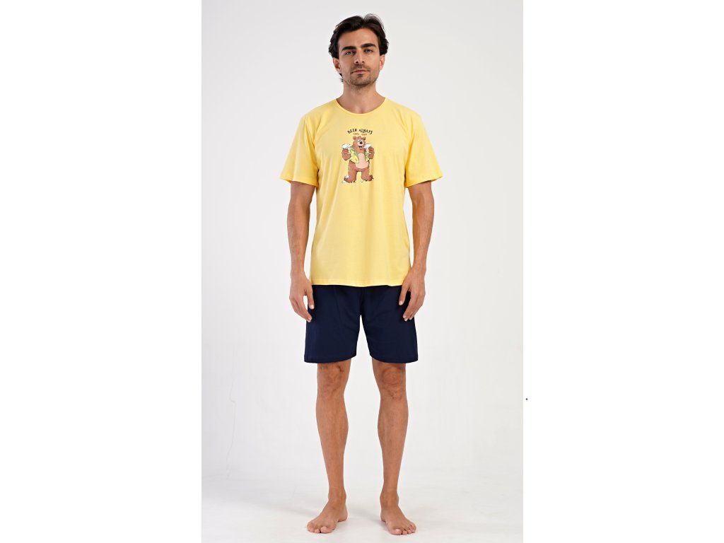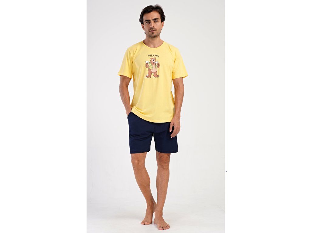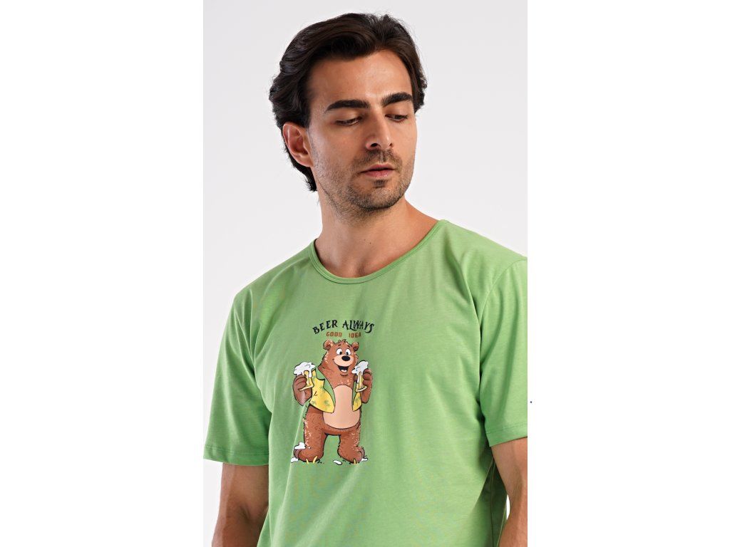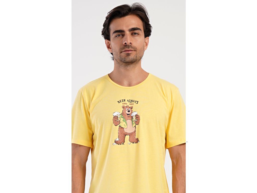 Pánske bavlnené šortkové pyžamo Beer always. Pánske pyžamo sa skladá z trička s krátkym rukávom a krátkych šortkových nohavíc. Na jednofarebnom tričku je obrázok medveďa s pivom a nápis 'Beer always'. Šortky majú praktické vrecká, v páse gumu a šnúrku na stiahnutie. Použitý materiál s podielom bavlny 100% je príjemný a poddaný na dotyk. Pyžamo oceníte obzvlášť v horúcich letných dňoch.
