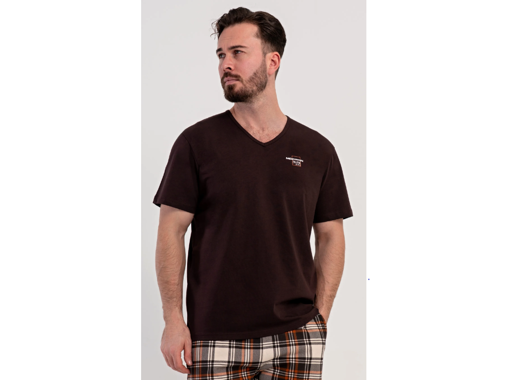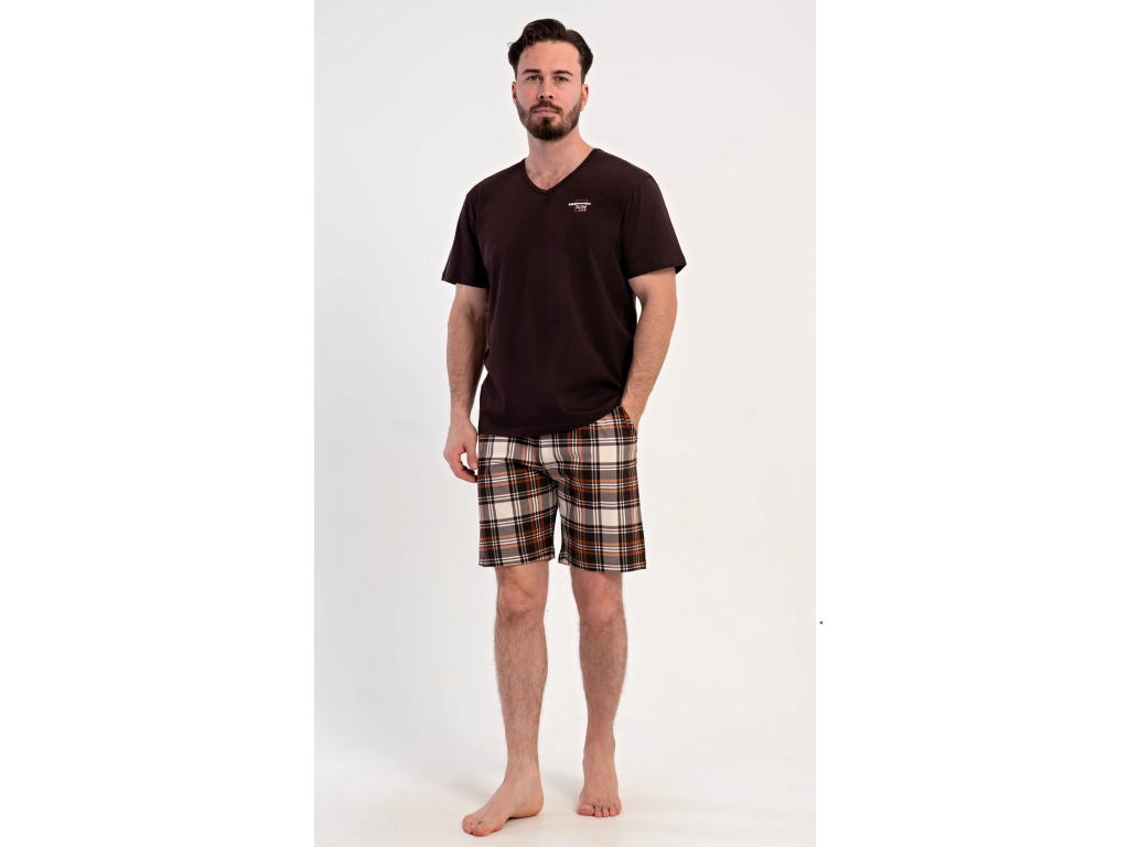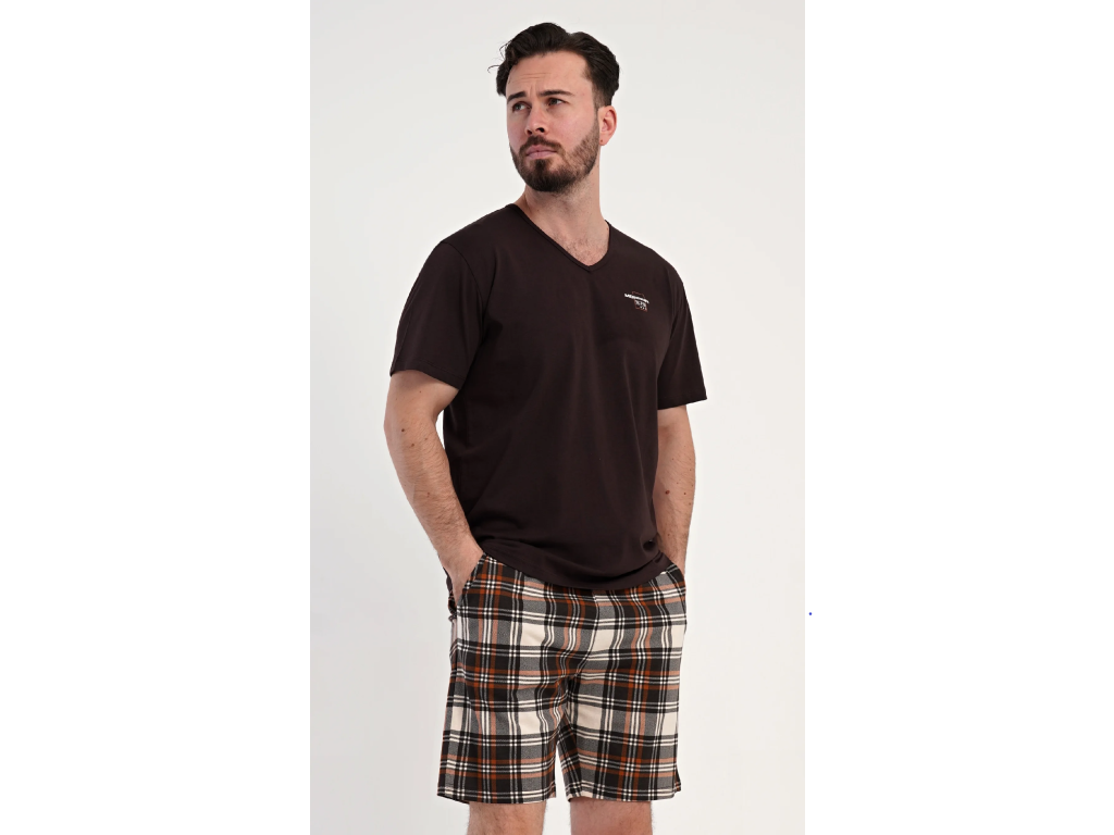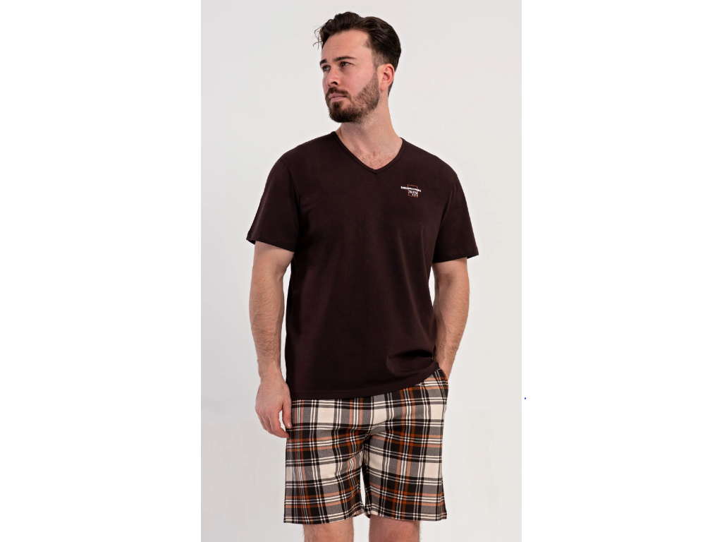 Pánske bavlnené šortkové pyžamo Daniel. Pánske pyžamo sa skladá z trička s krátkym rukávom a krátkych šortkových nohavíc. Tričko s okrúhlym výstrihom zdobí na hrudi drobný nápis. Tričko dopĺňajú kárované šortky, ktoré majú v páse gumu, šnúrku na stiahnutie a praktické vrecká. Použitý materiál s obsahom bavlny 100% je príjemný a poddajný na dotyk.