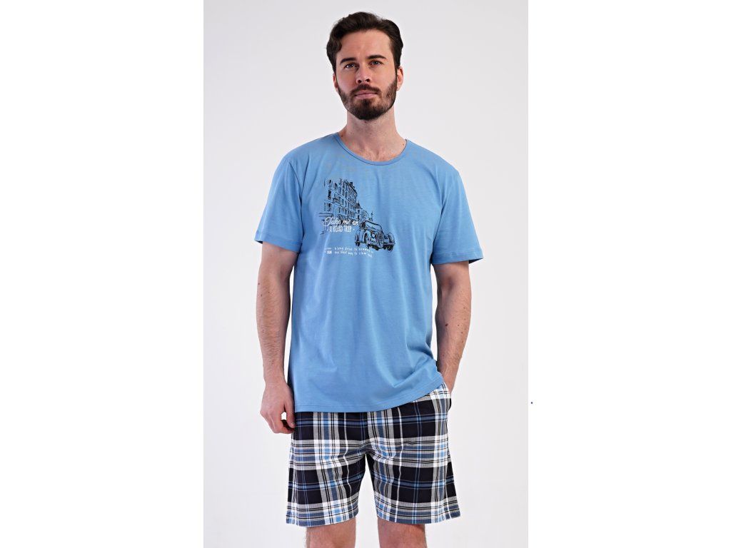 Pánske bavlnené šortkové pyžamo Felix. Pánske pyžamo sa skladá z trička s krátkym rukávom a krátkych šortkových nohavíc. Tričko s okrúhlym výstrihom zdobí na hrudi obrázok historického auta. Tričko dopĺňajú kárované šortky, ktoré majú v páse gumu, šnúrku na stiahnutie a praktické vrecká. Použitý materiál s obsahom bavlny 100% je príjemný a poddajný na dotyk.