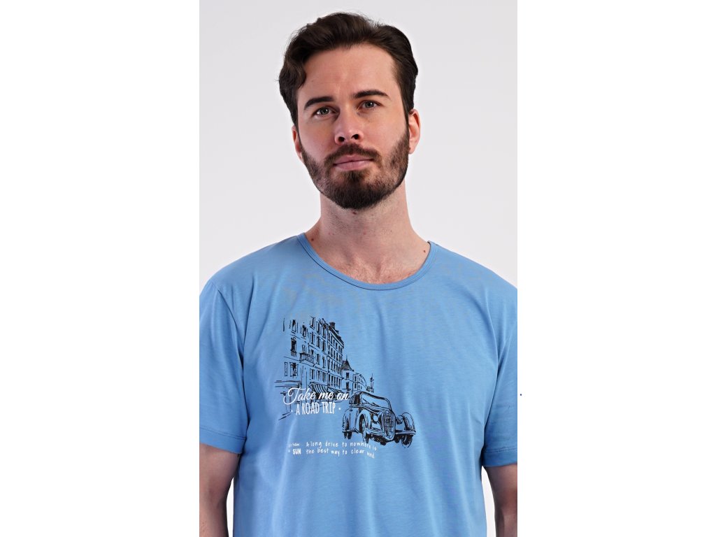 Pánske bavlnené šortkové pyžamo Felix. Pánske pyžamo sa skladá z trička s krátkym rukávom a krátkych šortkových nohavíc. Tričko s okrúhlym výstrihom zdobí na hrudi obrázok historického auta. Tričko dopĺňajú kárované šortky, ktoré majú v páse gumu, šnúrku na stiahnutie a praktické vrecká. Použitý materiál s obsahom bavlny 100% je príjemný a poddajný na dotyk.